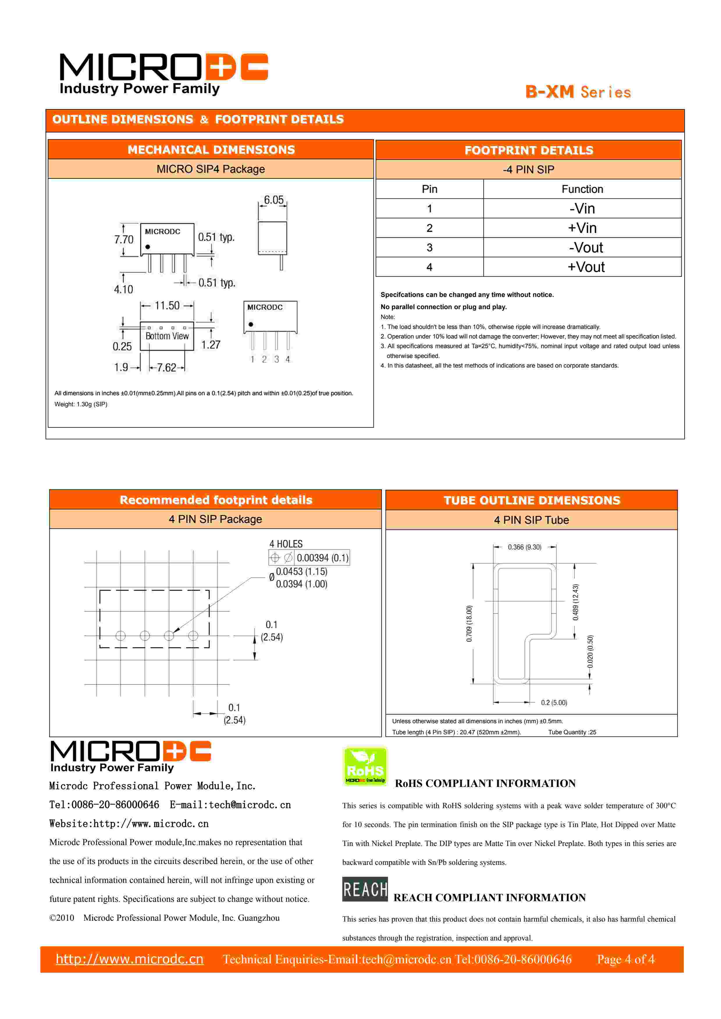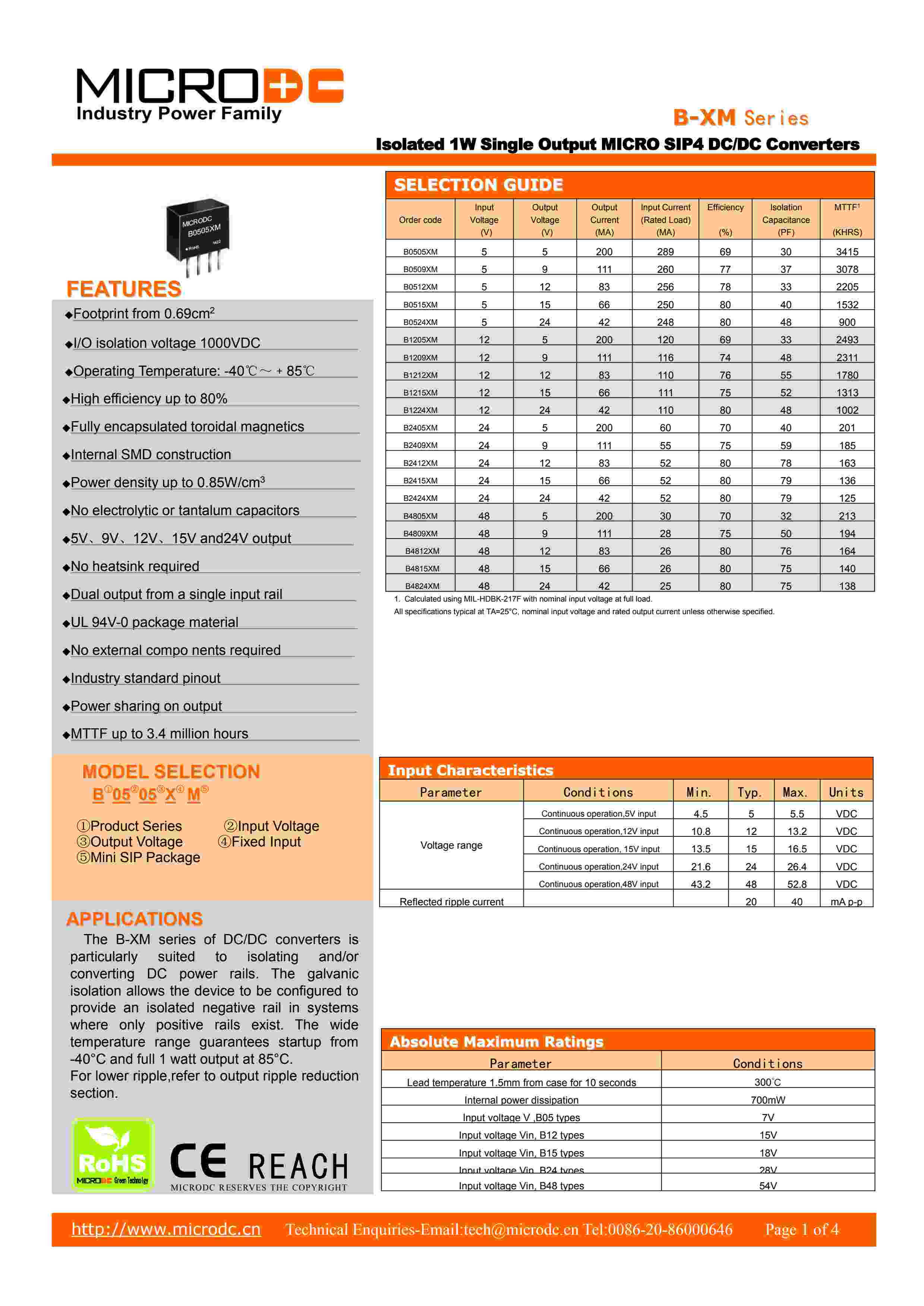 Isolated 1W Single Output MICRO SIP4 DC/DC Converters