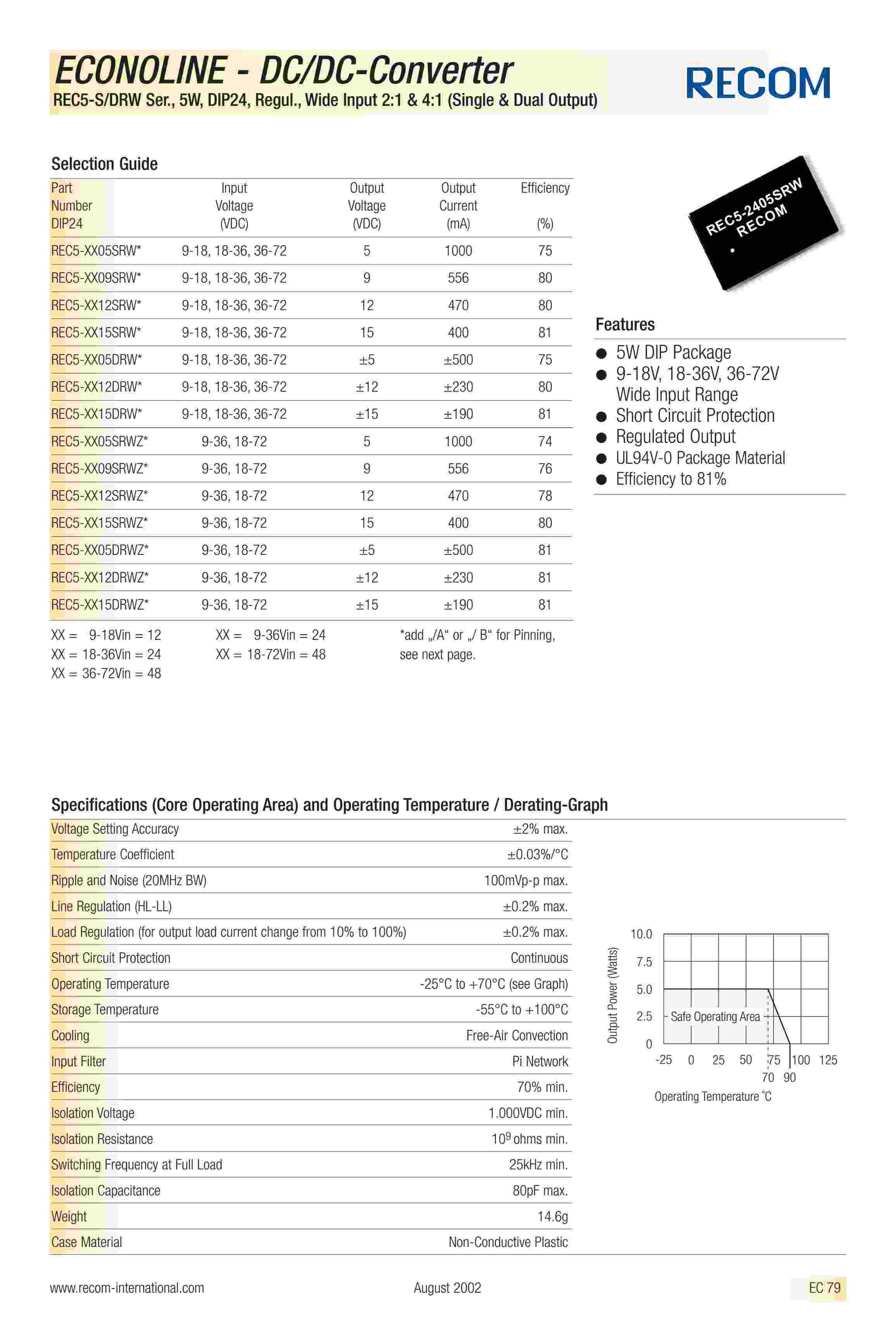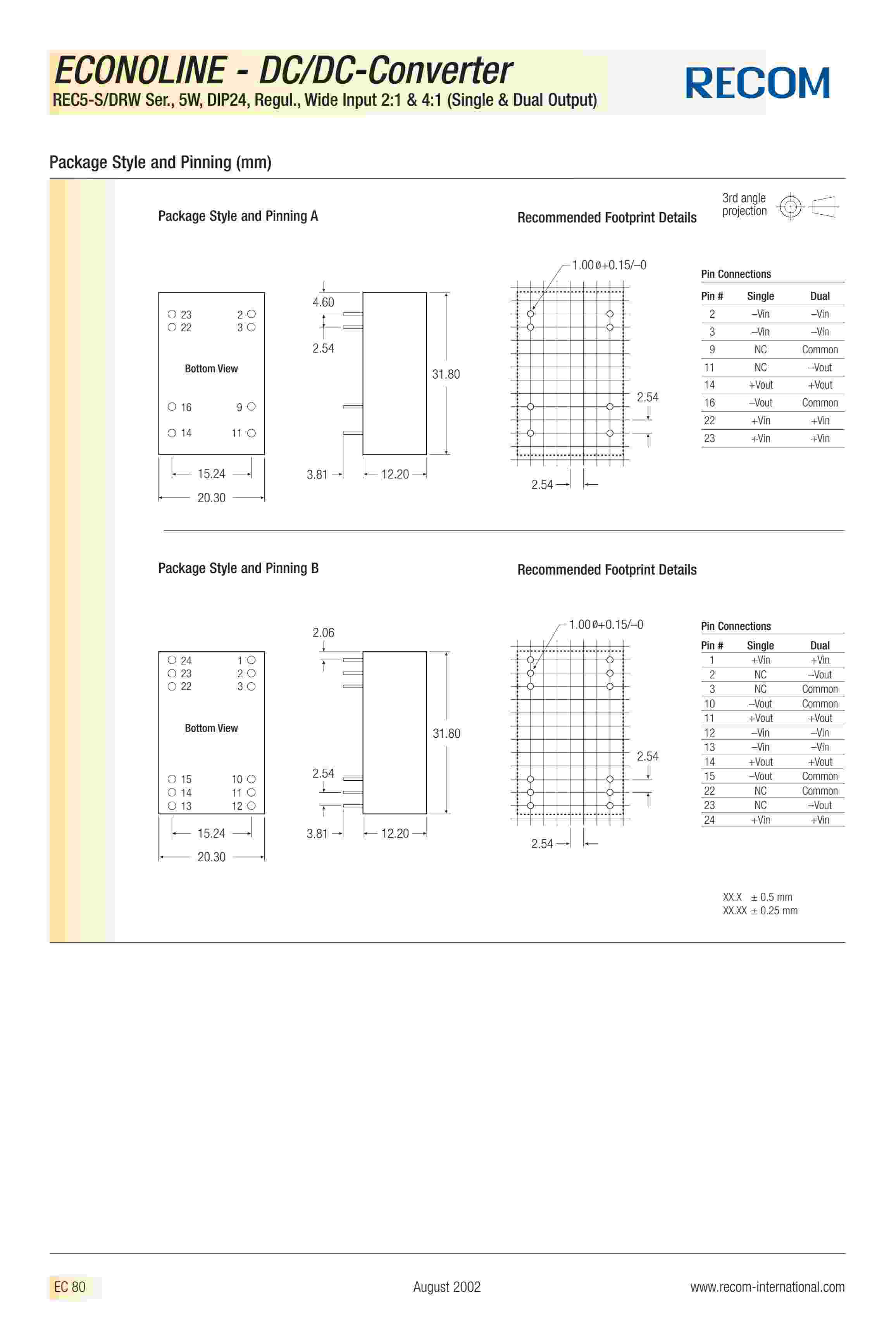 REC5-S/DRW Ser., 5W, DIP24, Regul., Wide Input 2:1 & 4:1 (Single & Dual Output)