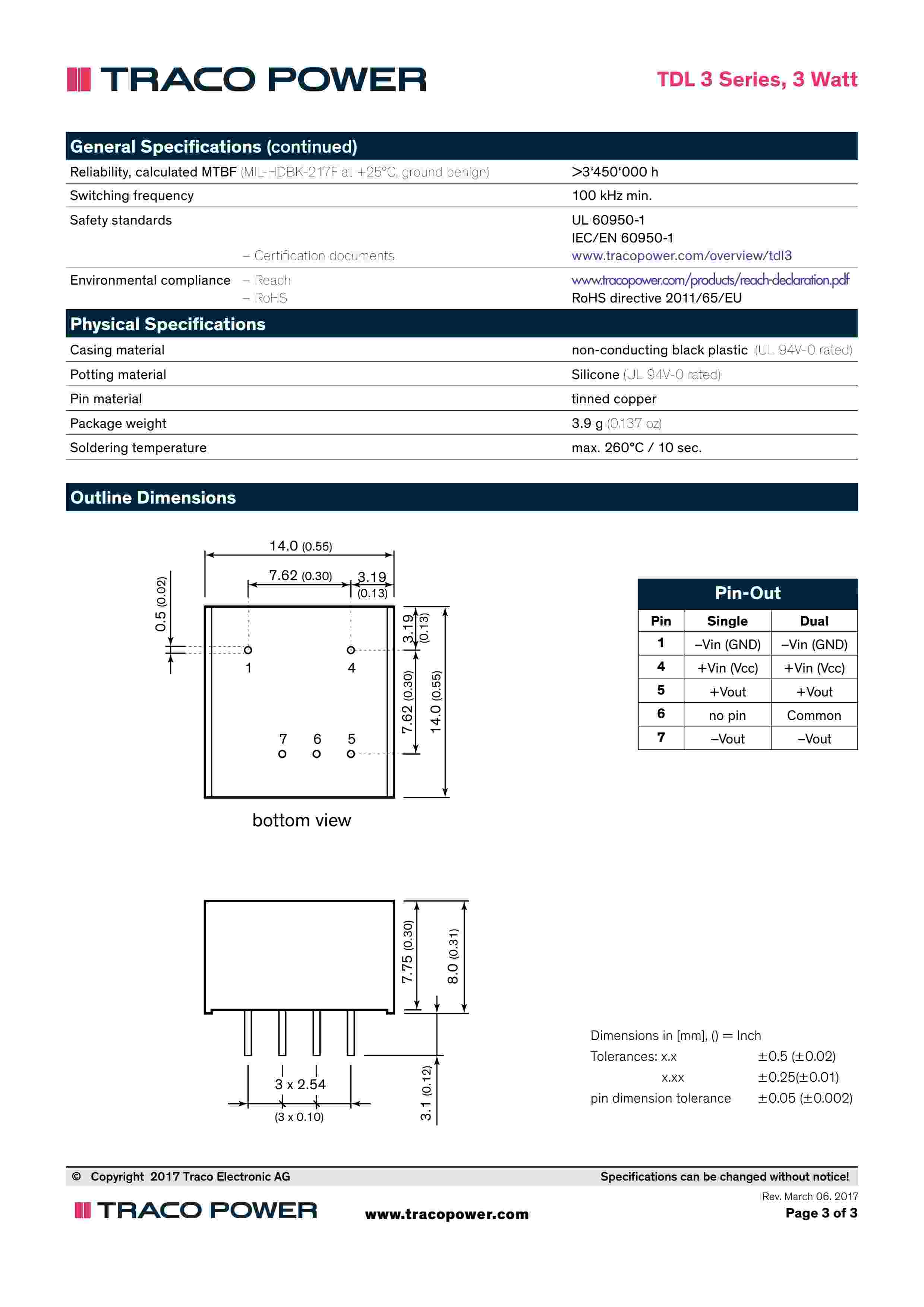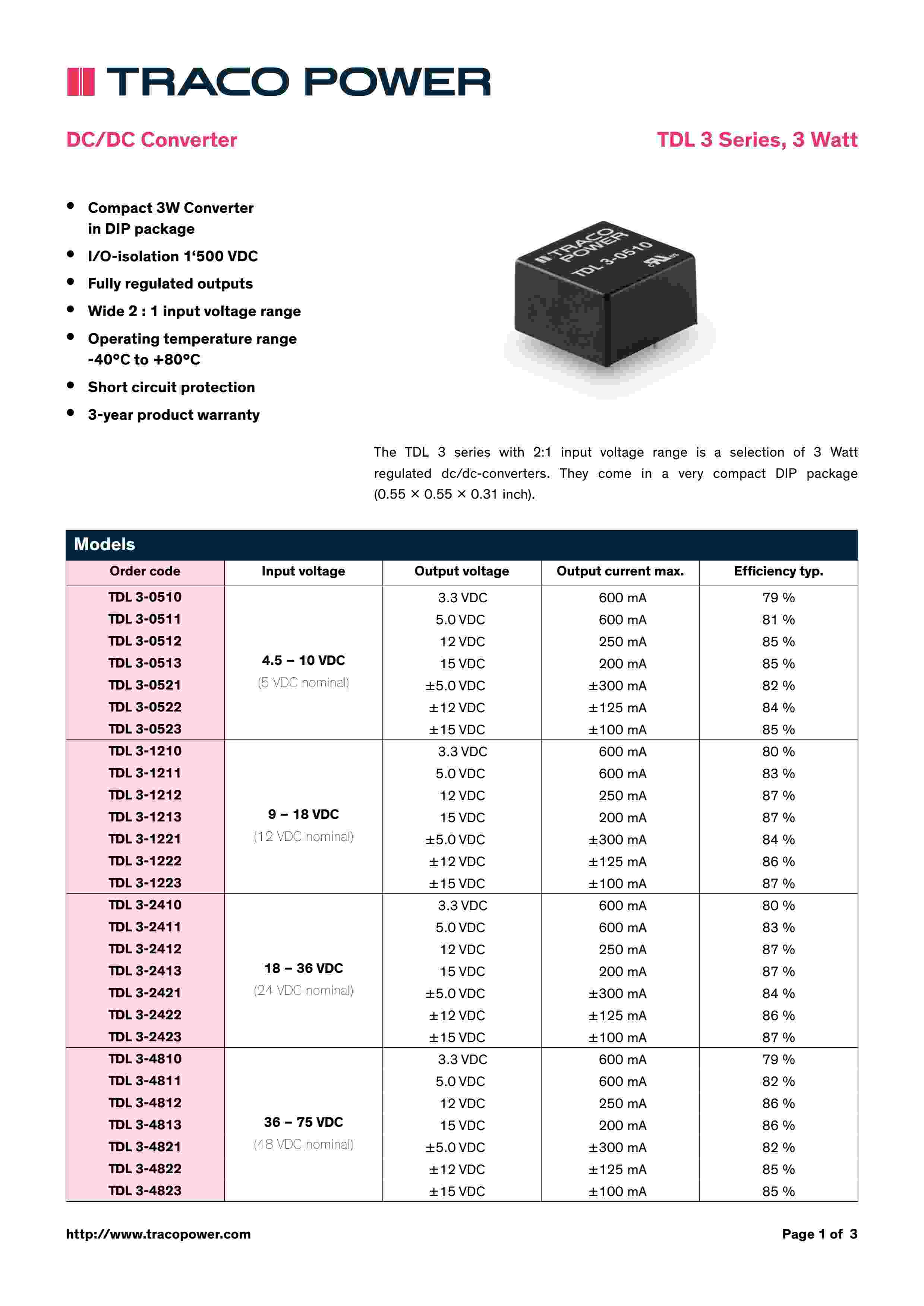 PCB Package, 3 Watt, regulated 1500 VAC I/O-isolation