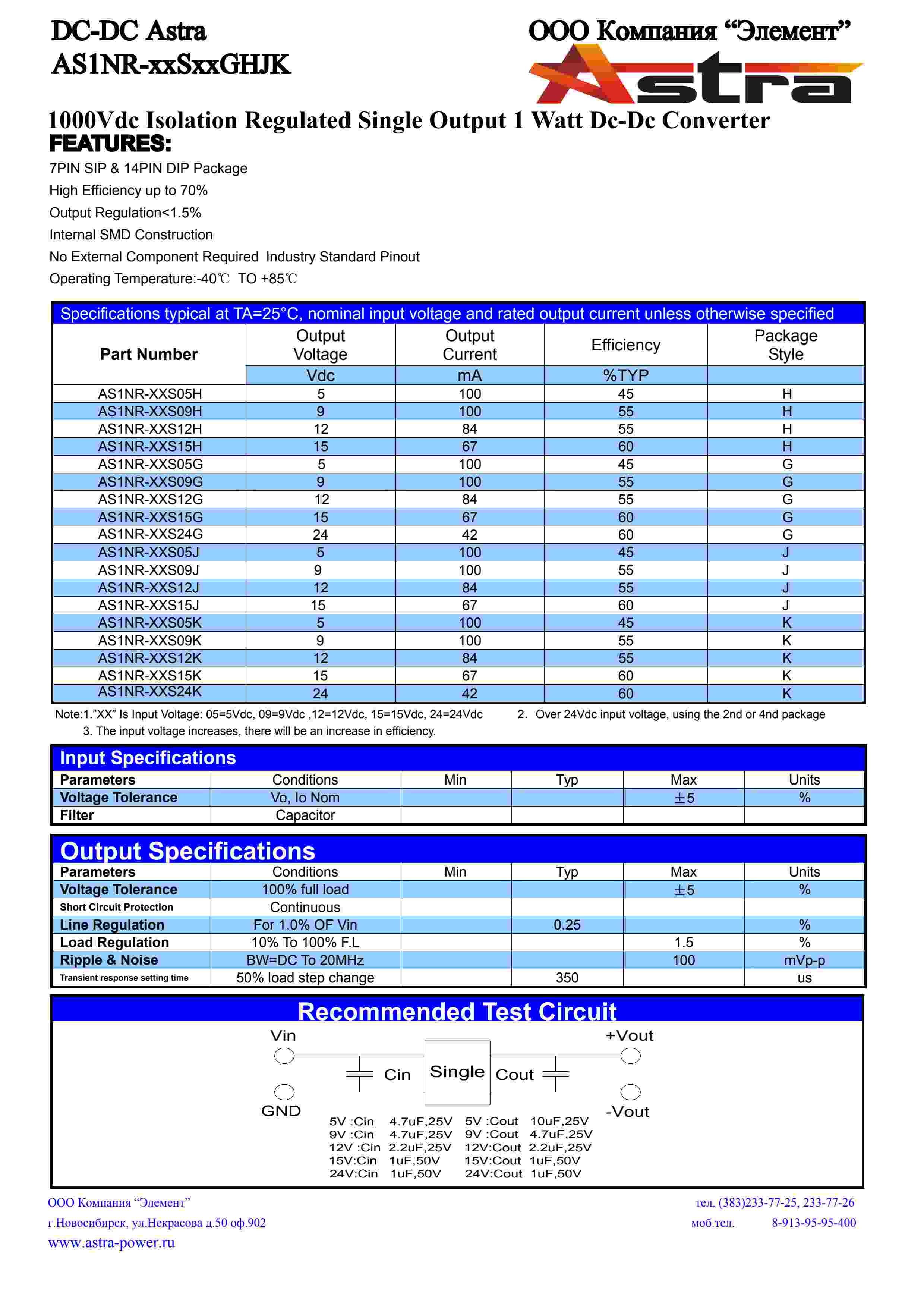 1000Vdc Isolation Regulated Single Output 1 Watt Dc-Dc Converter