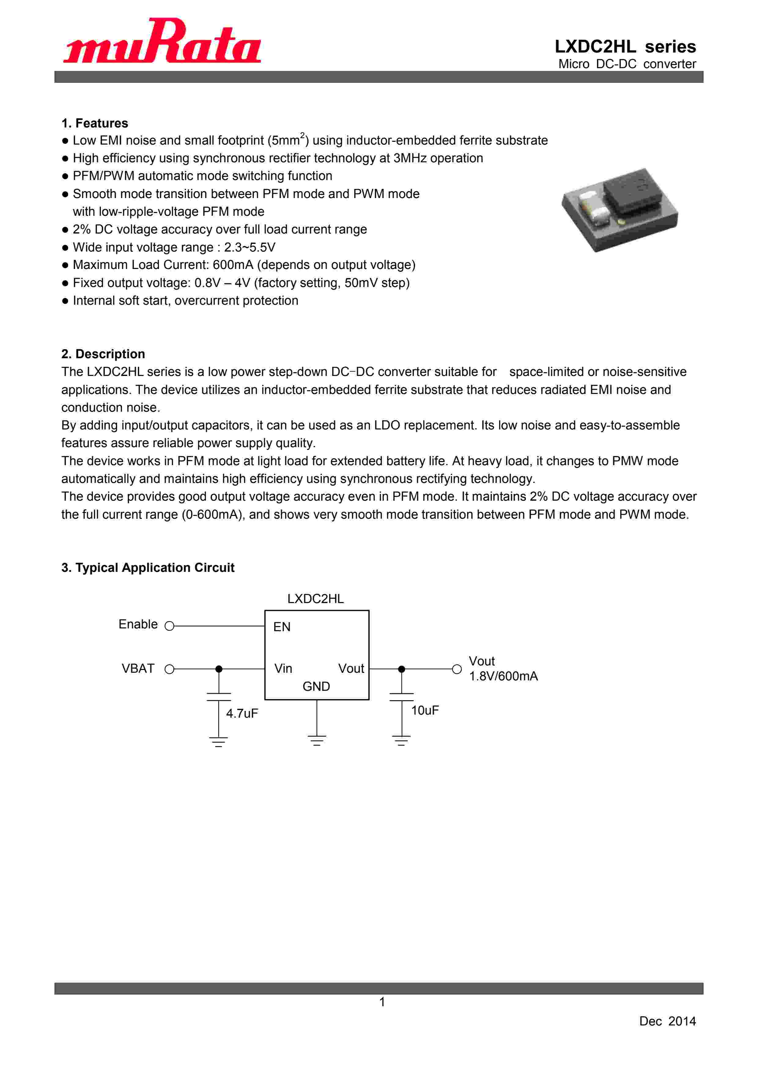| 描 述: | Low EMI noise and small footprint (5mm2) using inductor-embedded ferrite substrate,PFM/PWM automatic mode switching function, Smooth mode transition between PFM mode and PWM mode with low-ripple-voltage PFM mode | ||