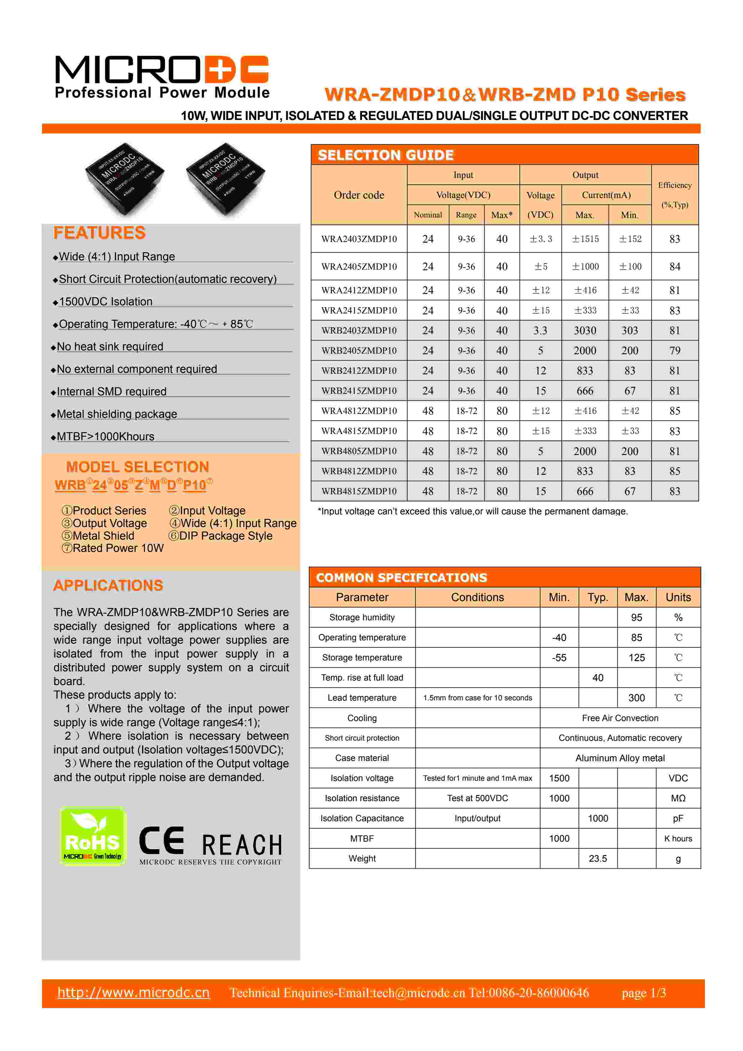 10W, WIDE INPUT, ISOLATED & REGULATED DUAL/SINGLE OUTPUT DC-DC CONVERTER