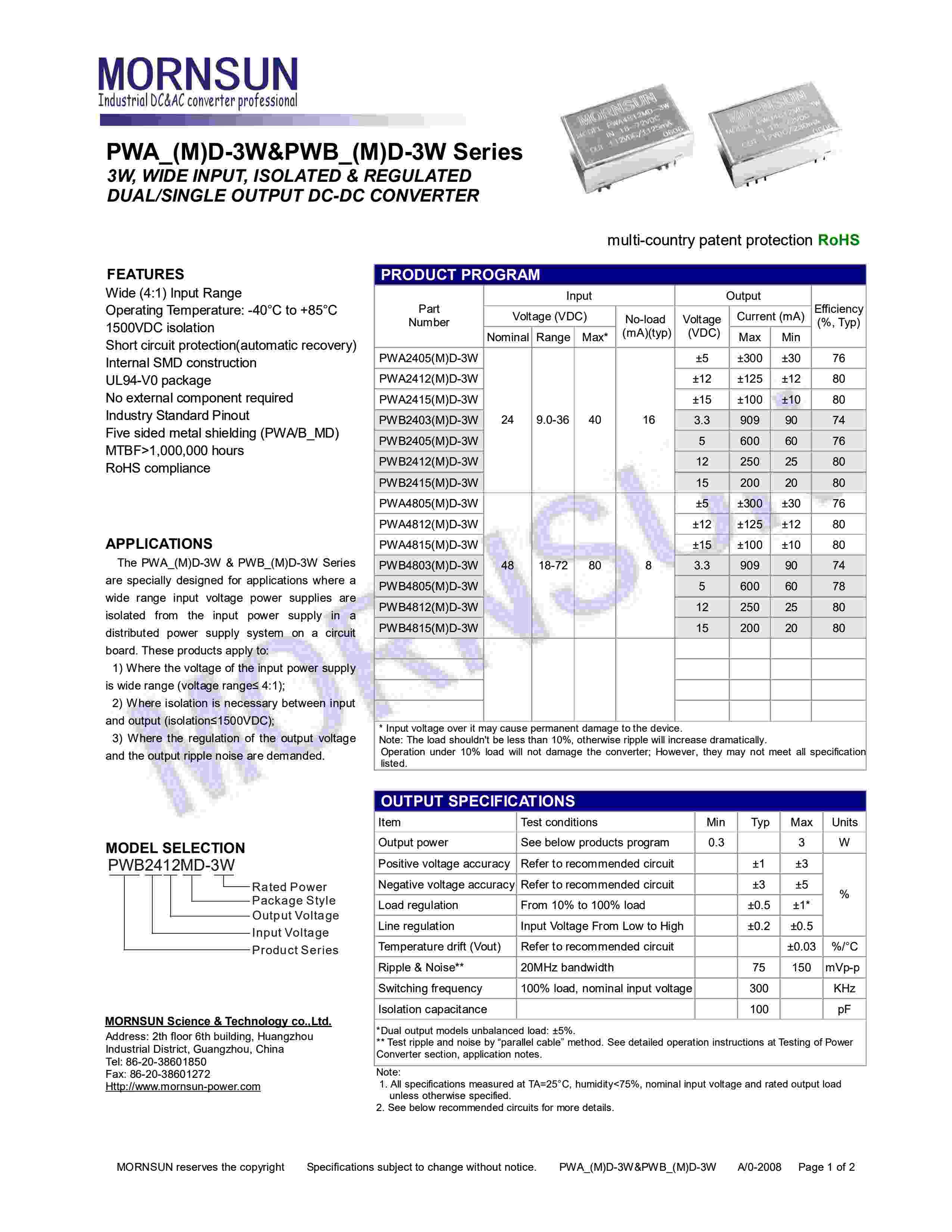 3W, WIDE INPUT, ISOLATED & REGULATED DUAL/SINGLE OUTPUT DC-DC CONVERTER