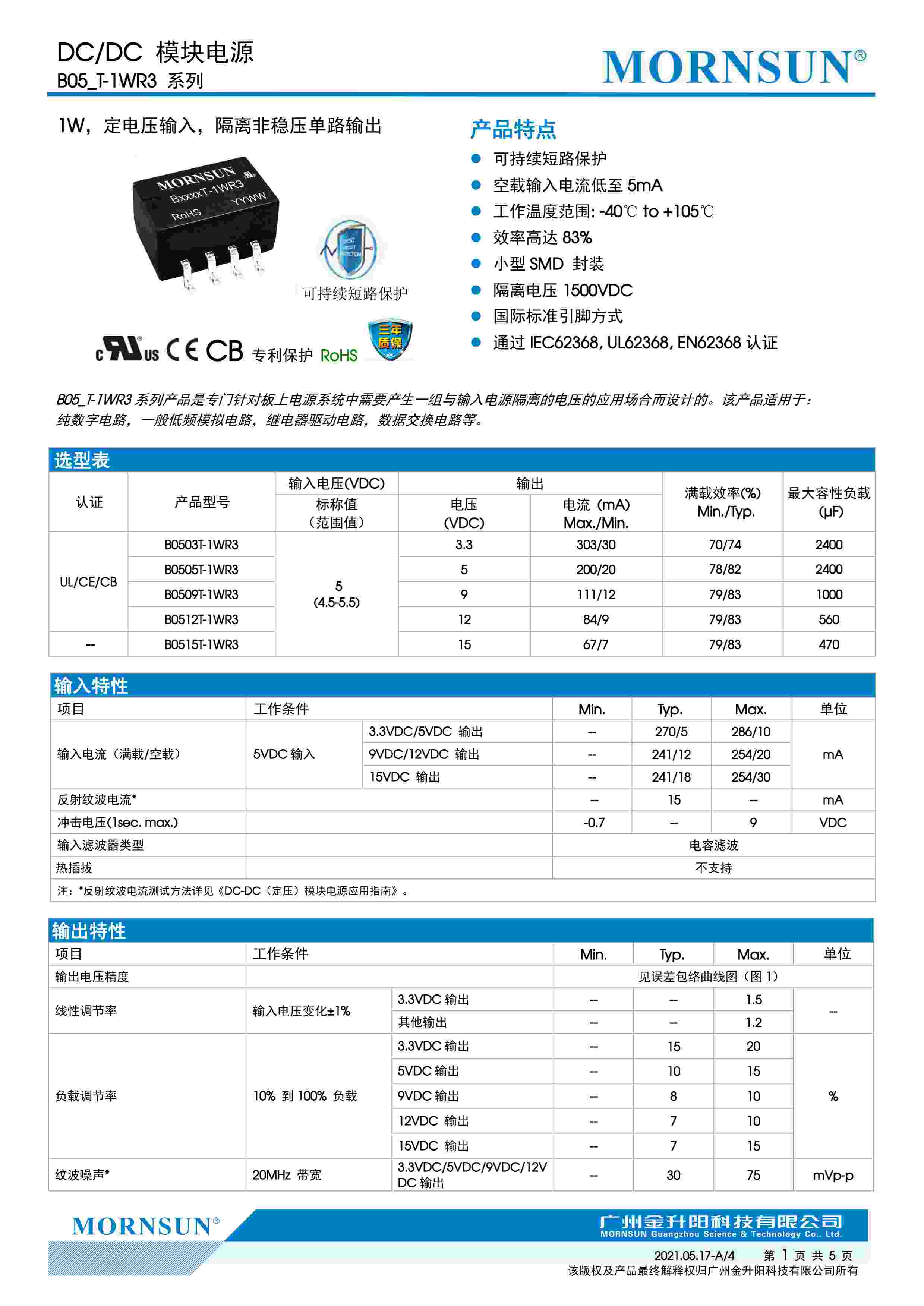1W,定电压输入,隔离非稳压单路输出
