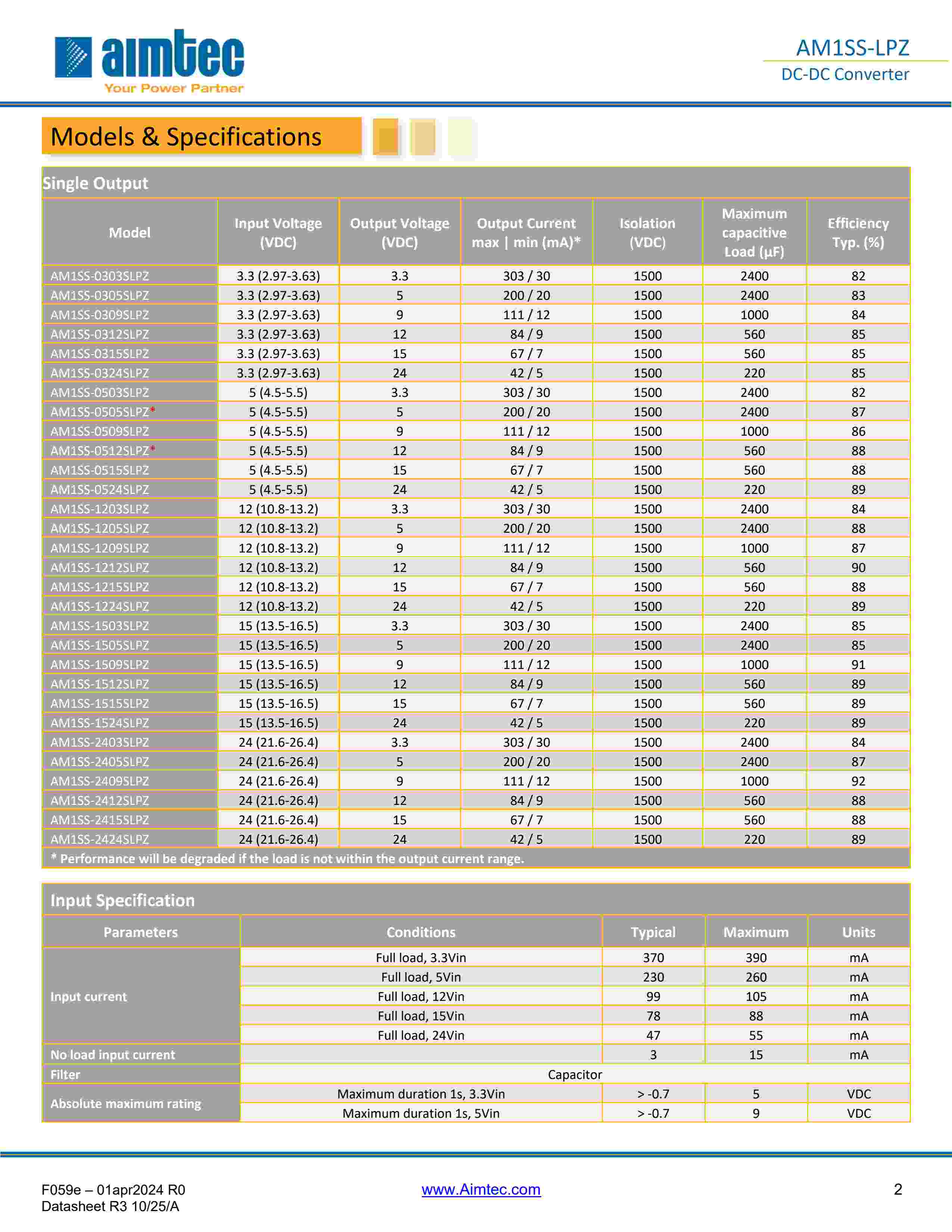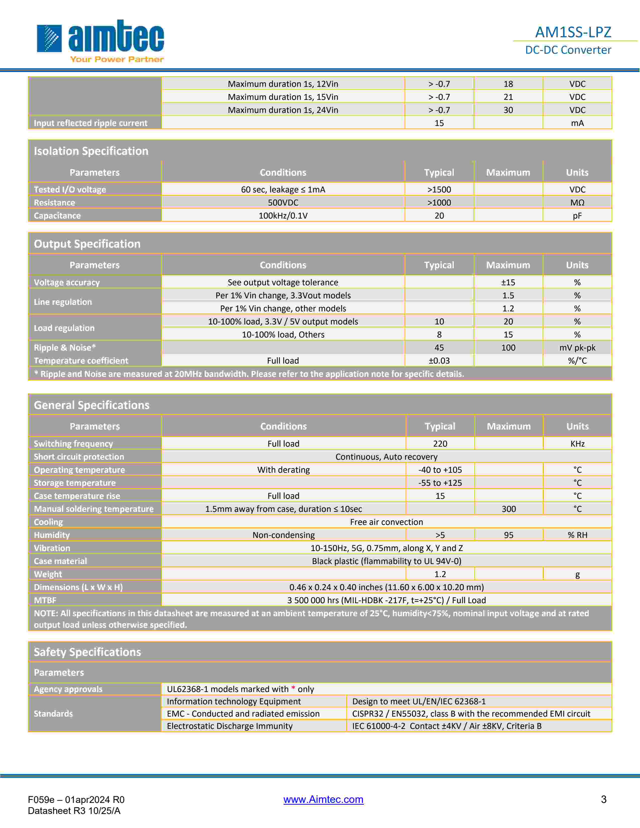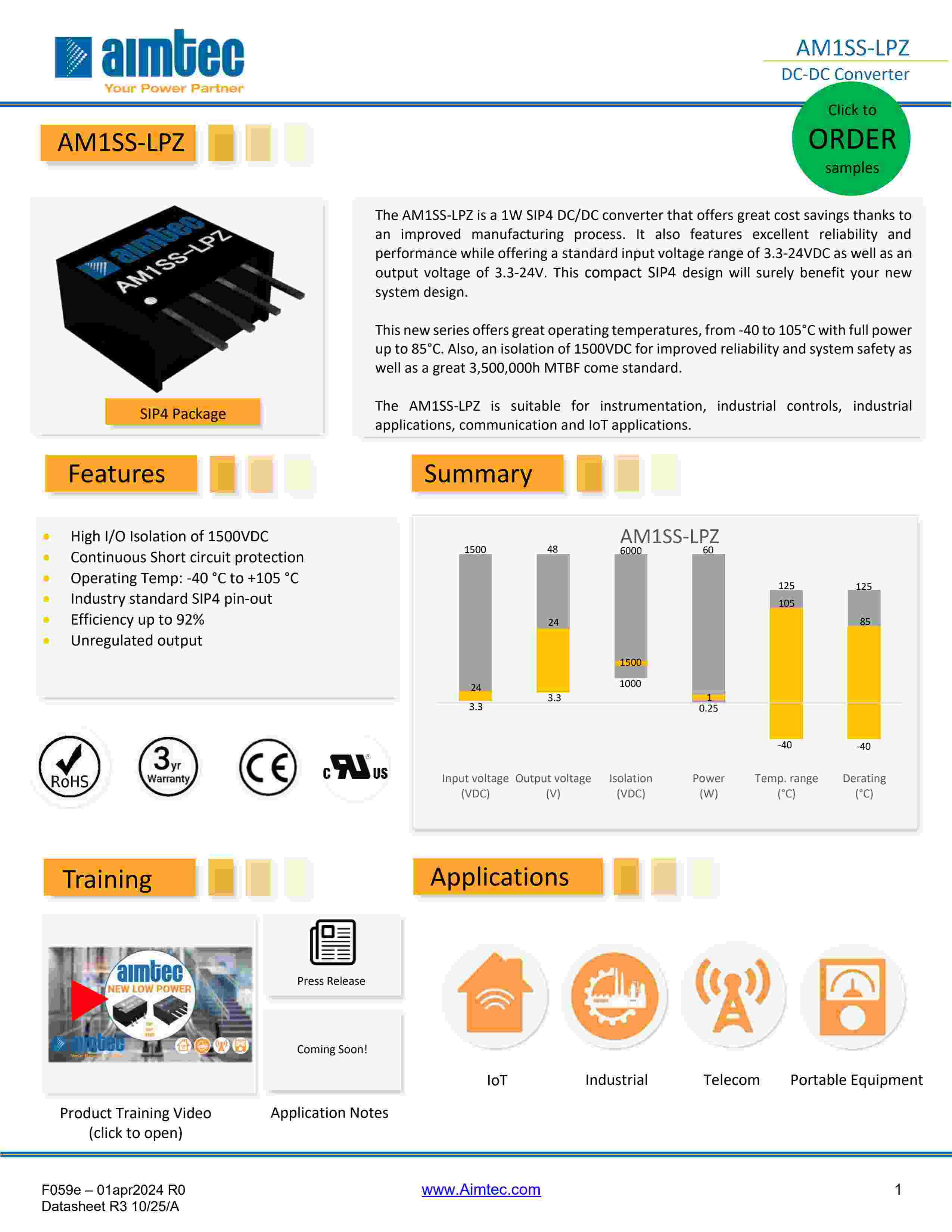 The AM1SS-LPZ is a 1W SIP4 DC/DC converter that offers great cost savings thanks to an improved manufacturing process. It also features excellent reliability and performance while offering a standard input voltage range of 3.3-24VDC as well as an output voltage of 3.3-24V. This compact SIP4 design will surely benefit your new system design. This new series offers great operating temperatures, from -40 to 105°C with full power up to 85°C. Also, an isolation of 1500VDC for improved reliability and system safety as well as a great 3,500,000h MTBF come standard. The AM1SS-LPZ is suitable for instrumentation, industrial controls, industrial applications, communication and IoT applications.