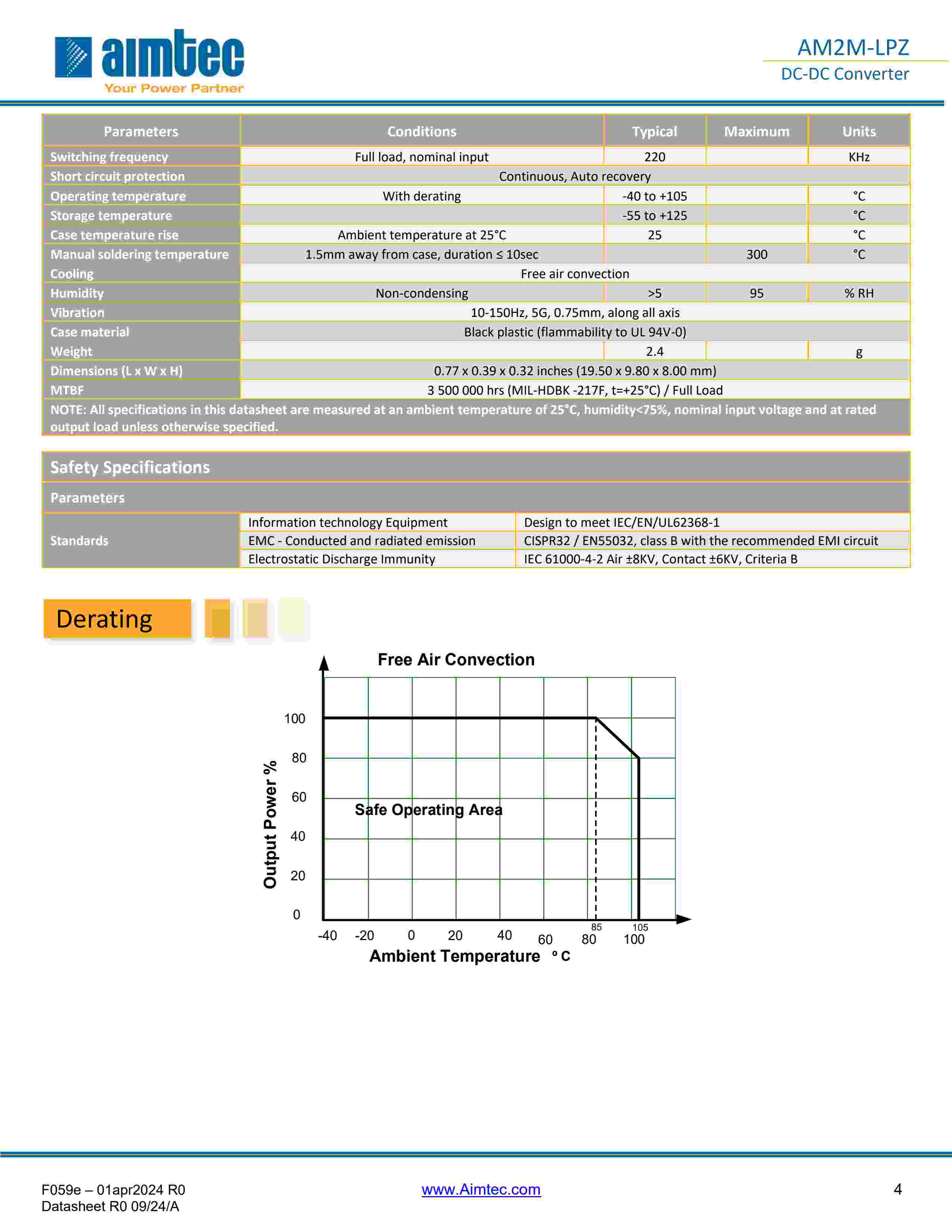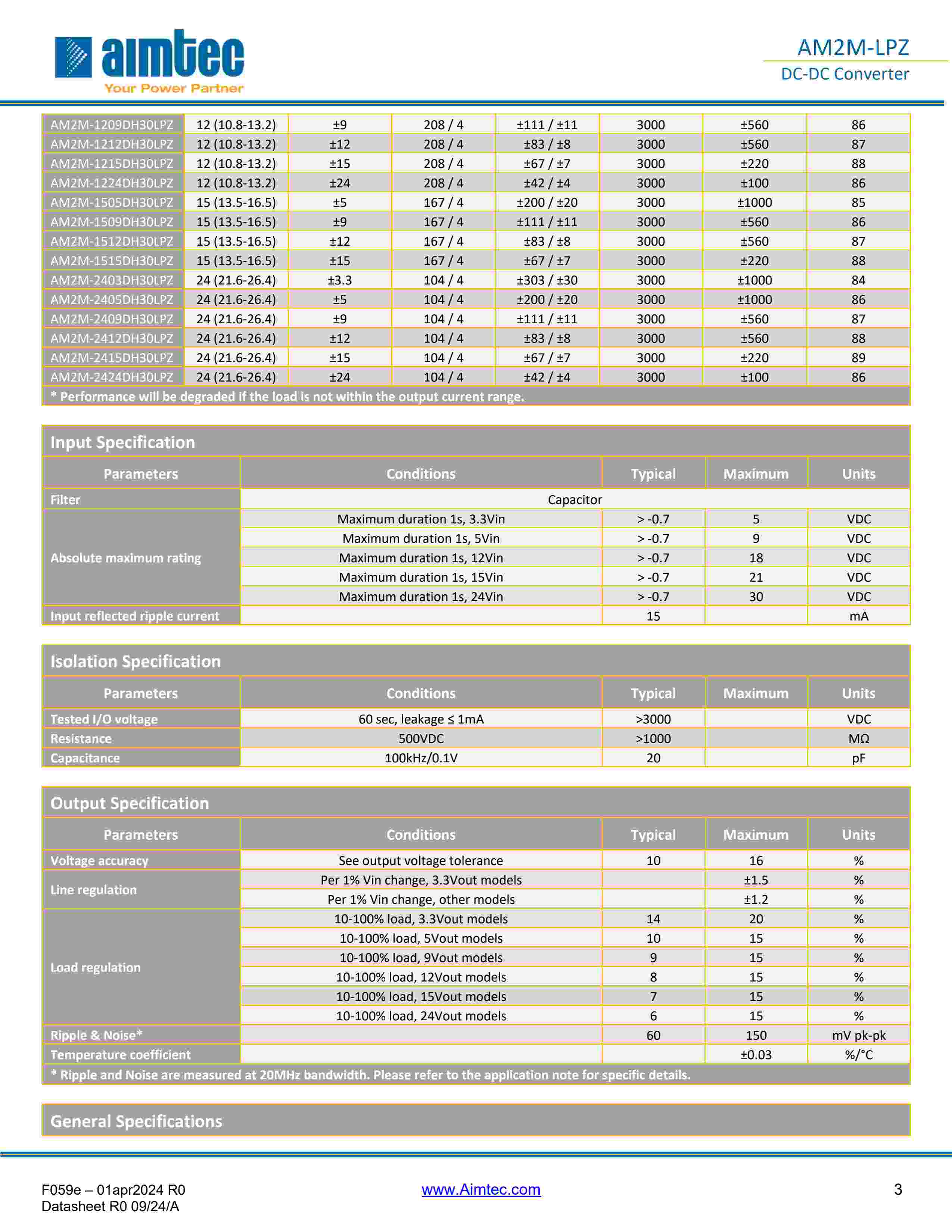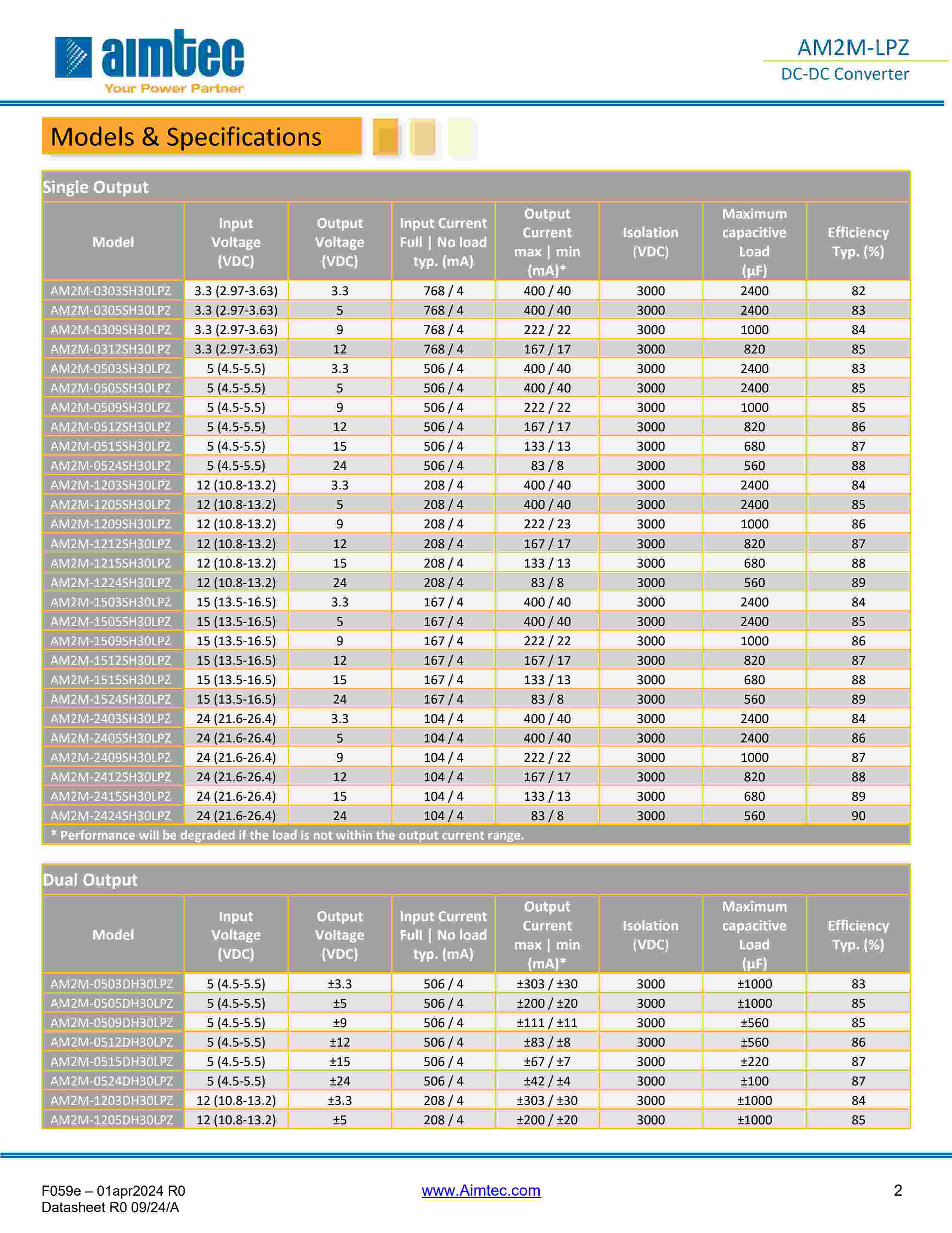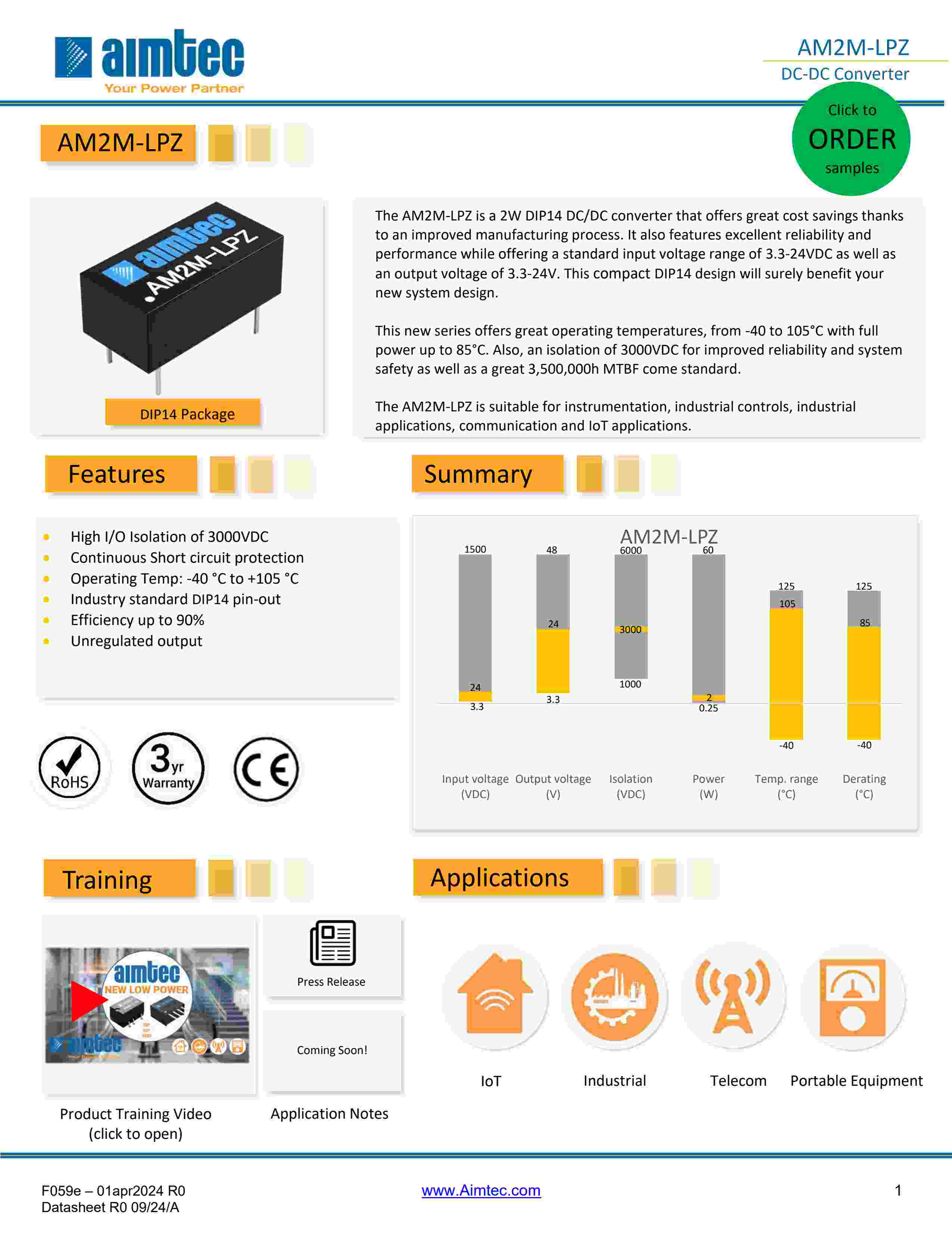 The AM2M-LPZ is a 2W DIP14 DC/DC converter that offers great cost savings thanks to an improved manufacturing process. It also features excellent reliability and performance while offering a standard input voltage range of 3.3-24VDC as well as an output voltage of 3.3-24V. This compact DIP14 design will surely benefit your new system design. This new series offers great operating temperatures, from -40 to 105°C with full power up to 85°C. Also, an isolation of 3000VDC for improved reliability and system safety as well as a great 3,500,000h MTBF come standard. The AM2M-LPZ is suitable for instrumentation, industrial controls, industrial applications, communication and IoT applications.