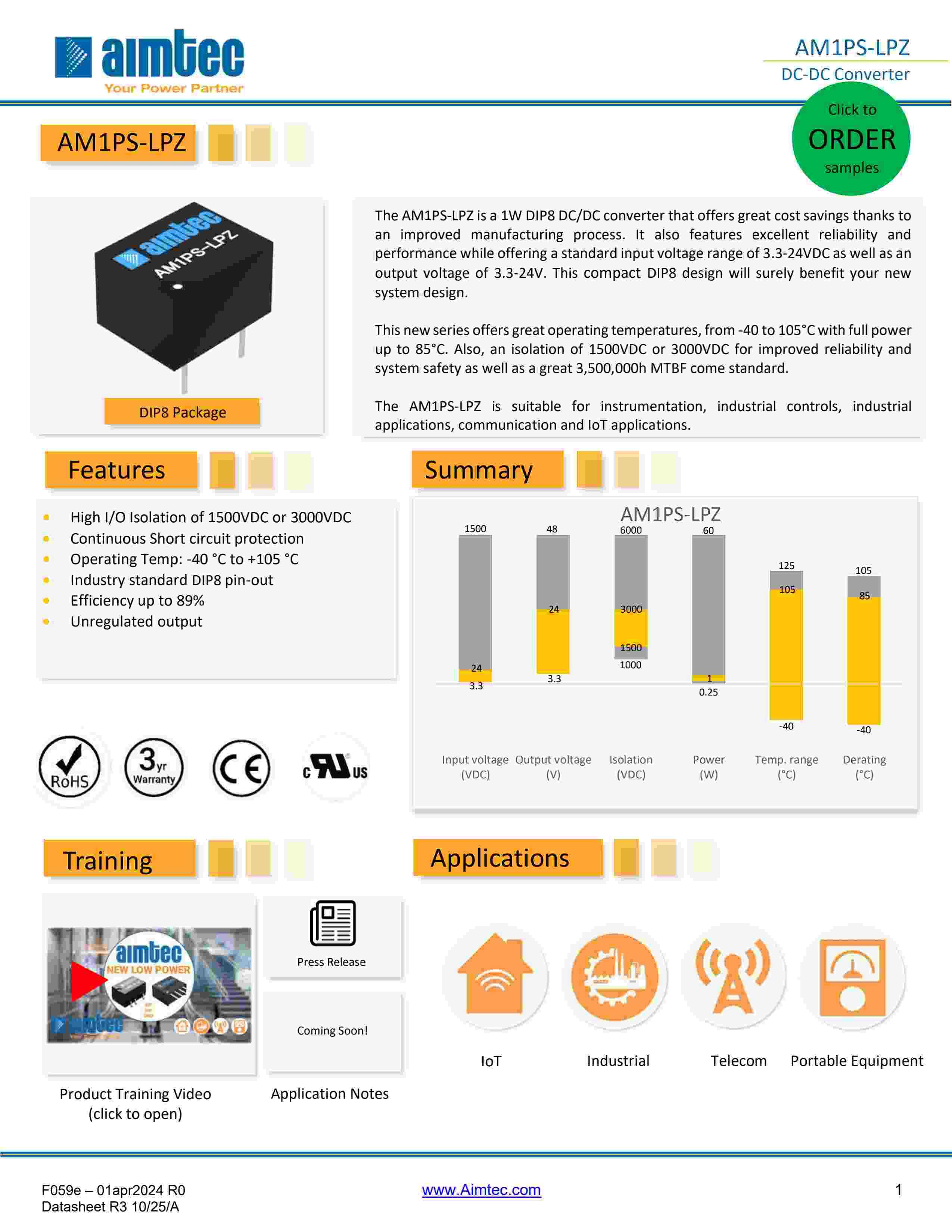 The AM1PS-LPZ is a 1W DIP8 DC/DC converter that offers great cost savings thanks to an improved manufacturing process. It also features excellent reliability and performance while offering a standard input voltage range of 3.3-24VDC as well as an output voltage of 3.3-24V. This compact DIP8 design will surely benefit your new system design. This new series offers great operating temperatures, from -40 to 105°C with full power up to 85°C. Also, an isolation of 1500VDC or 3000VDC for improved reliability and system safety as well as a great 3,500,000h MTBF come standard. The AM1PS-LPZ is suitable for instrumentation, industrial controls, industrial applications, communication and IoT applications