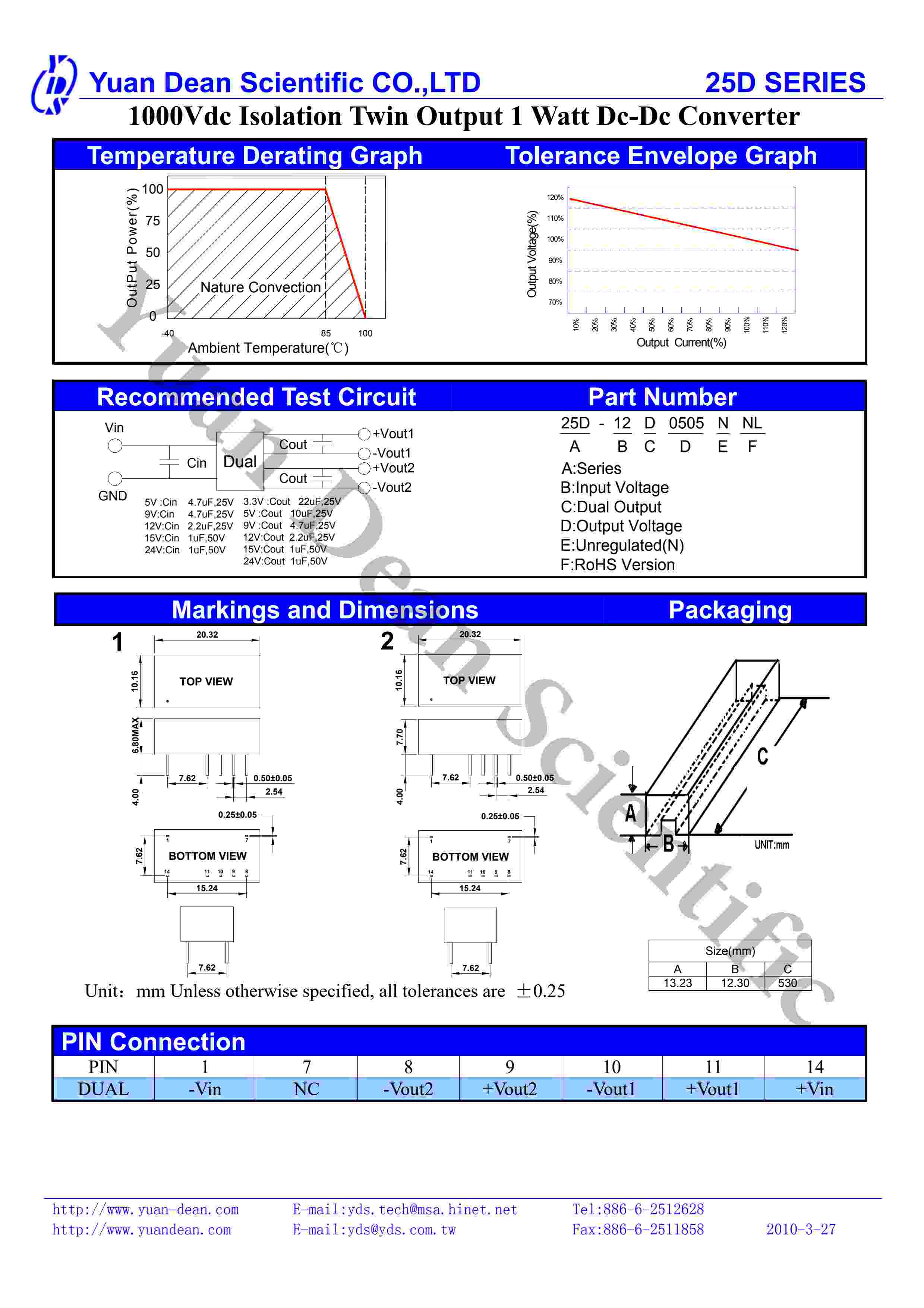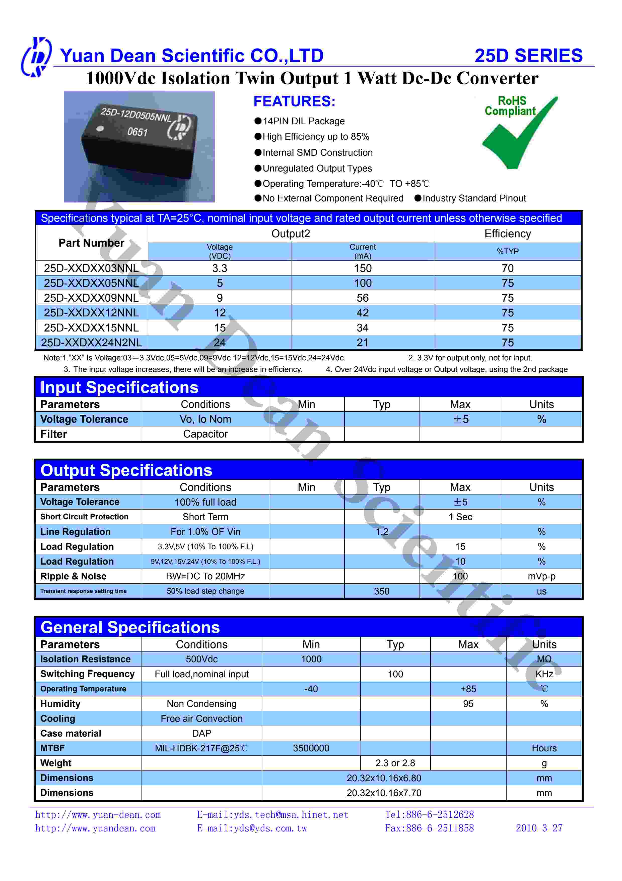 1000Vdc Isolation Twin Output 1 Watt Dc-Dc Converter