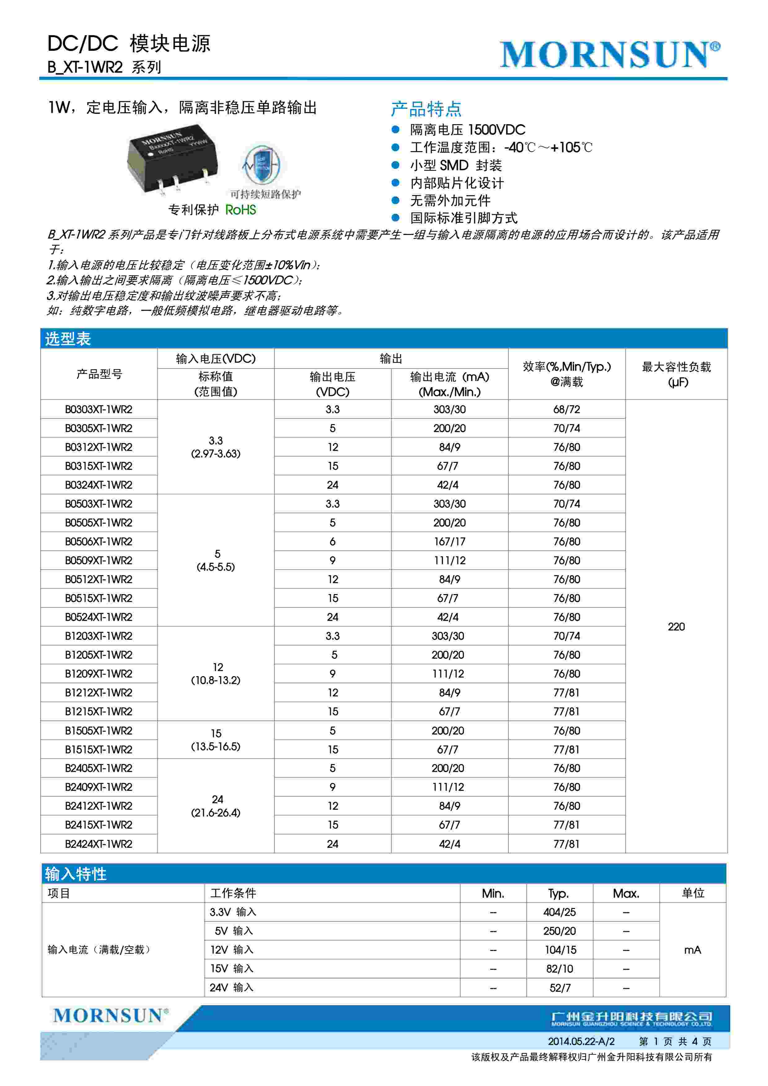 1W,定电压输入,隔离非稳压单路输出