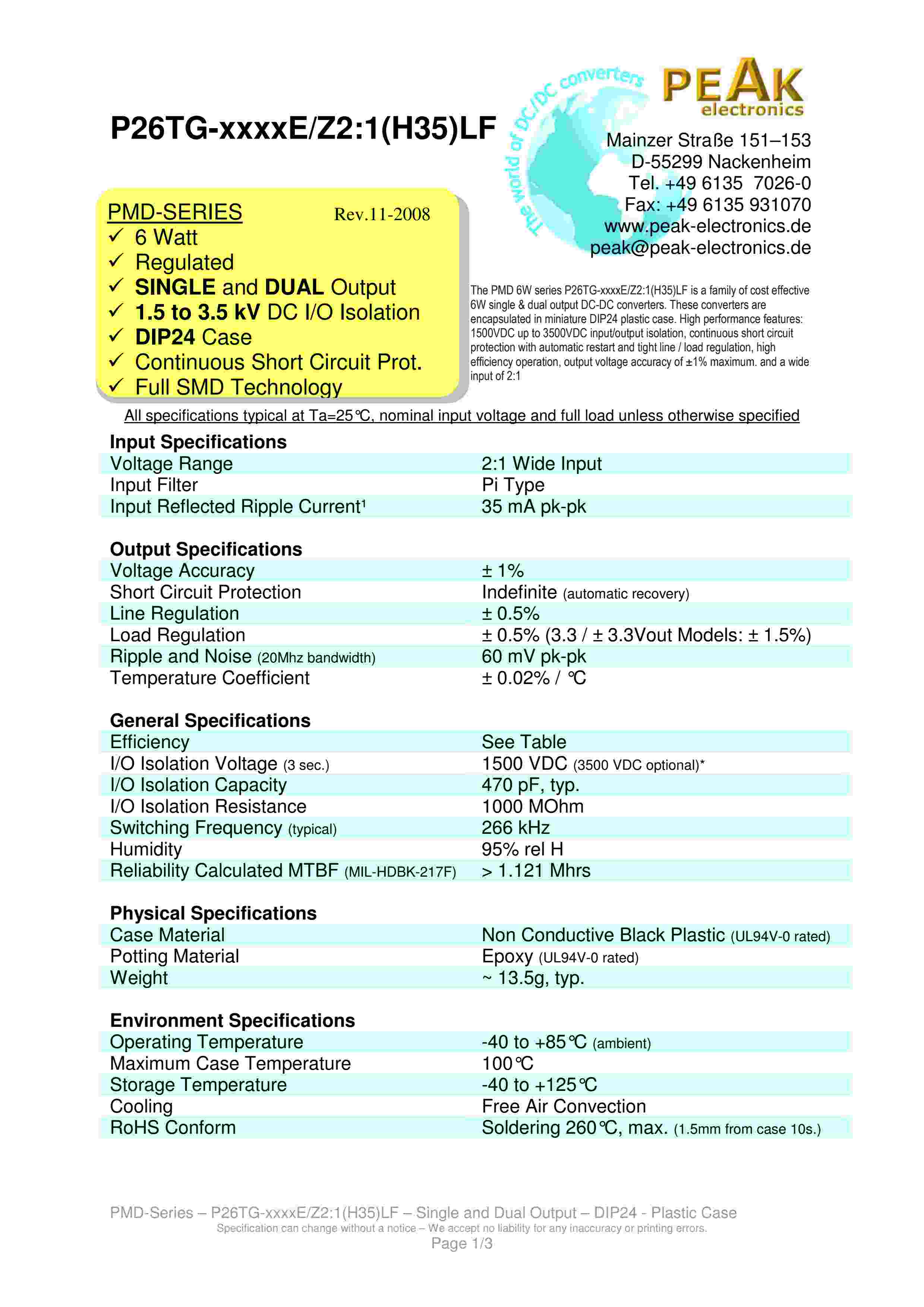 | 描 述: | PMD-SERIES 6 Watt Regulated SINGLE and DUAL Output 1.5 to 3.5 kV DC I/O Isolation DIP24 Case Continuous Short Circuit Prot. Full SMD Technology | ||
