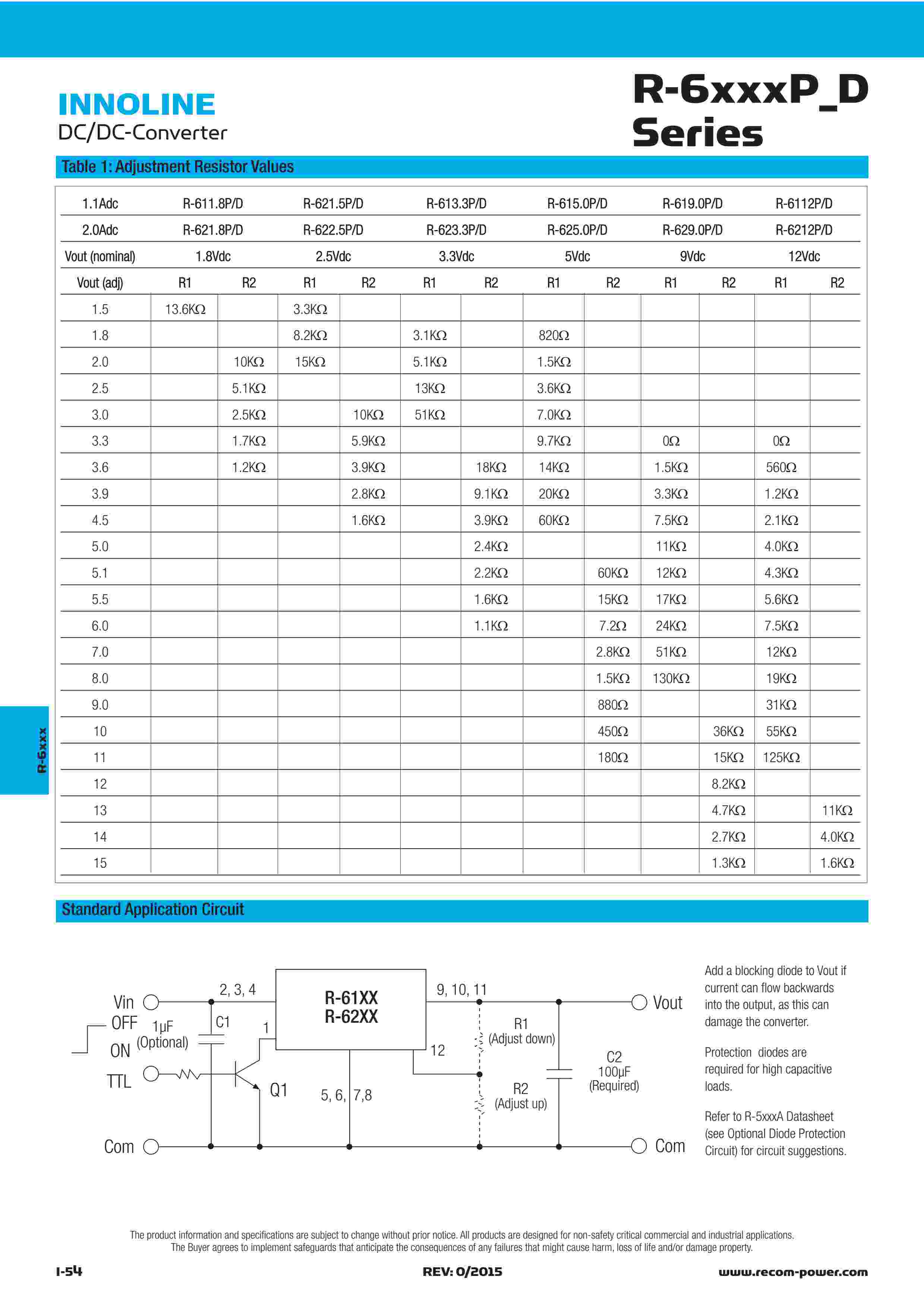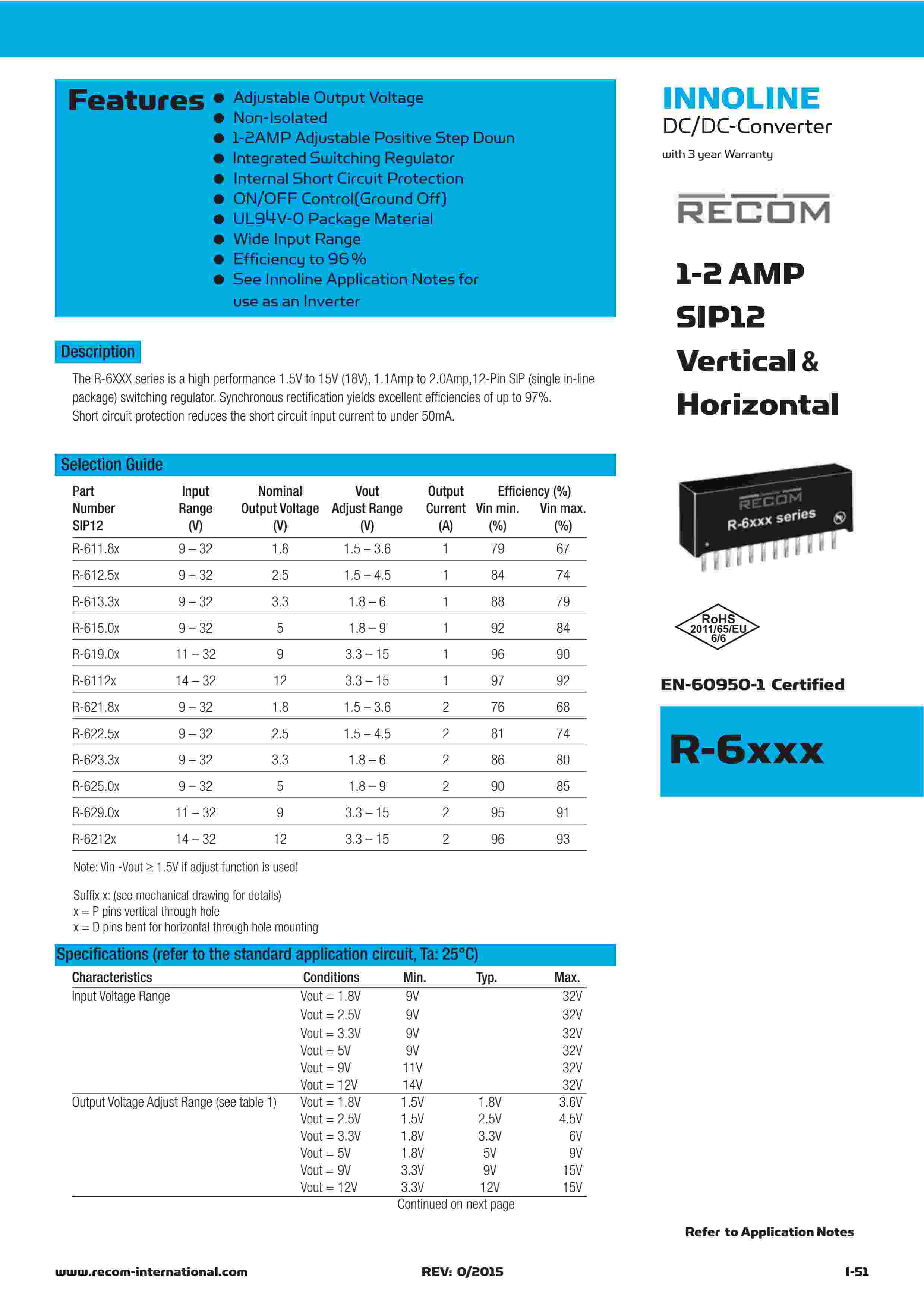 | 描 述: | ● Adjustable Output Voltage● Non-Isolated● 1-2AMP Adjustable Positive Step Down ● Integrated Switching Regulator● Internal Short Circuit Protection● ON/OFF Control(Ground Off)● UL94V-0 Package Material● Wide Input Range● Efficiency to 96 %● See Innoline Application Notes for use as an Inverter | ||