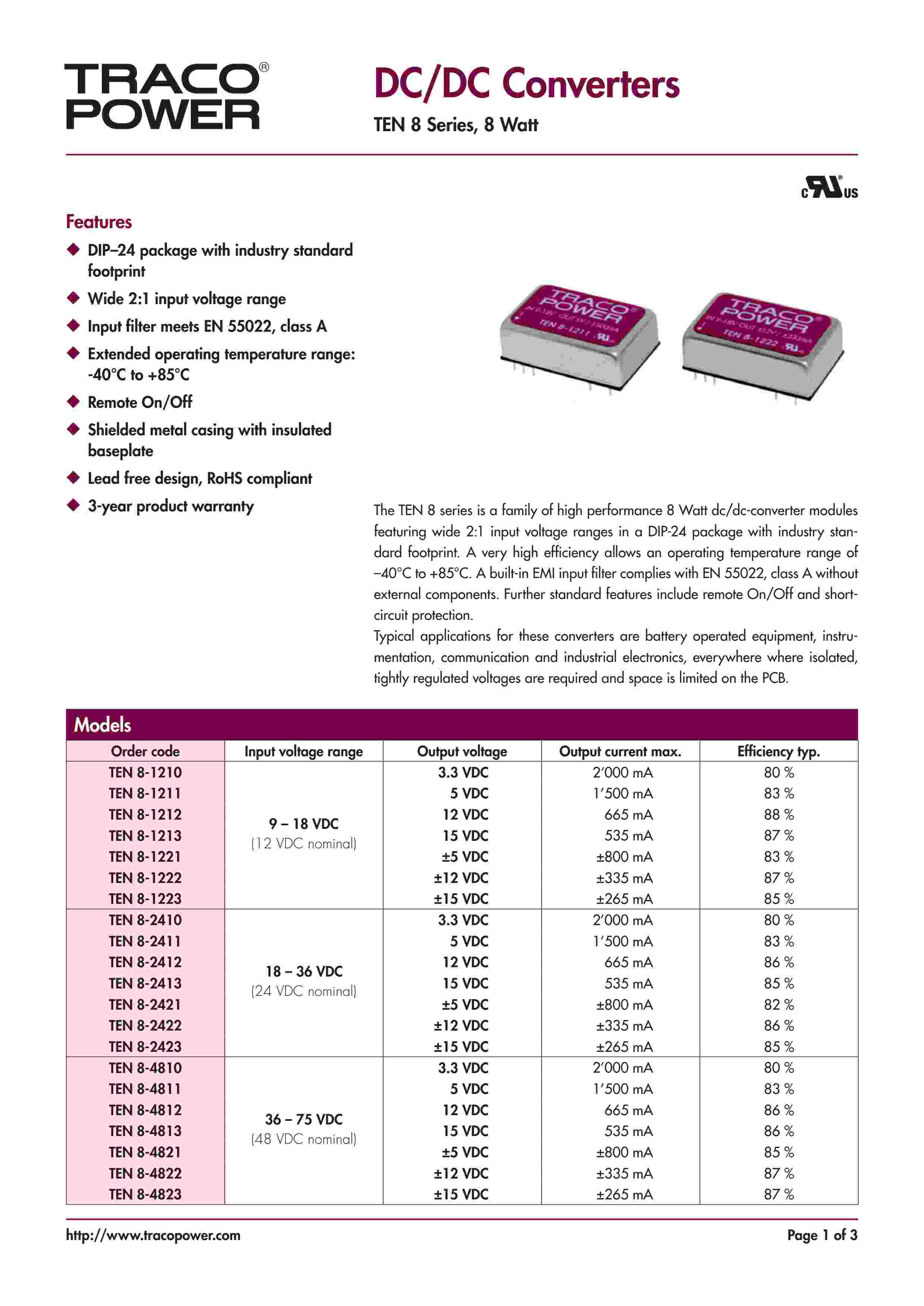 | 描 述: | The TEN 8 series is a family of high performance 8 Watt dc/dc-converter modules featuring wide 2:1 input voltage ranges in a DIP-24 package with industry stan- dard footprint. | ||