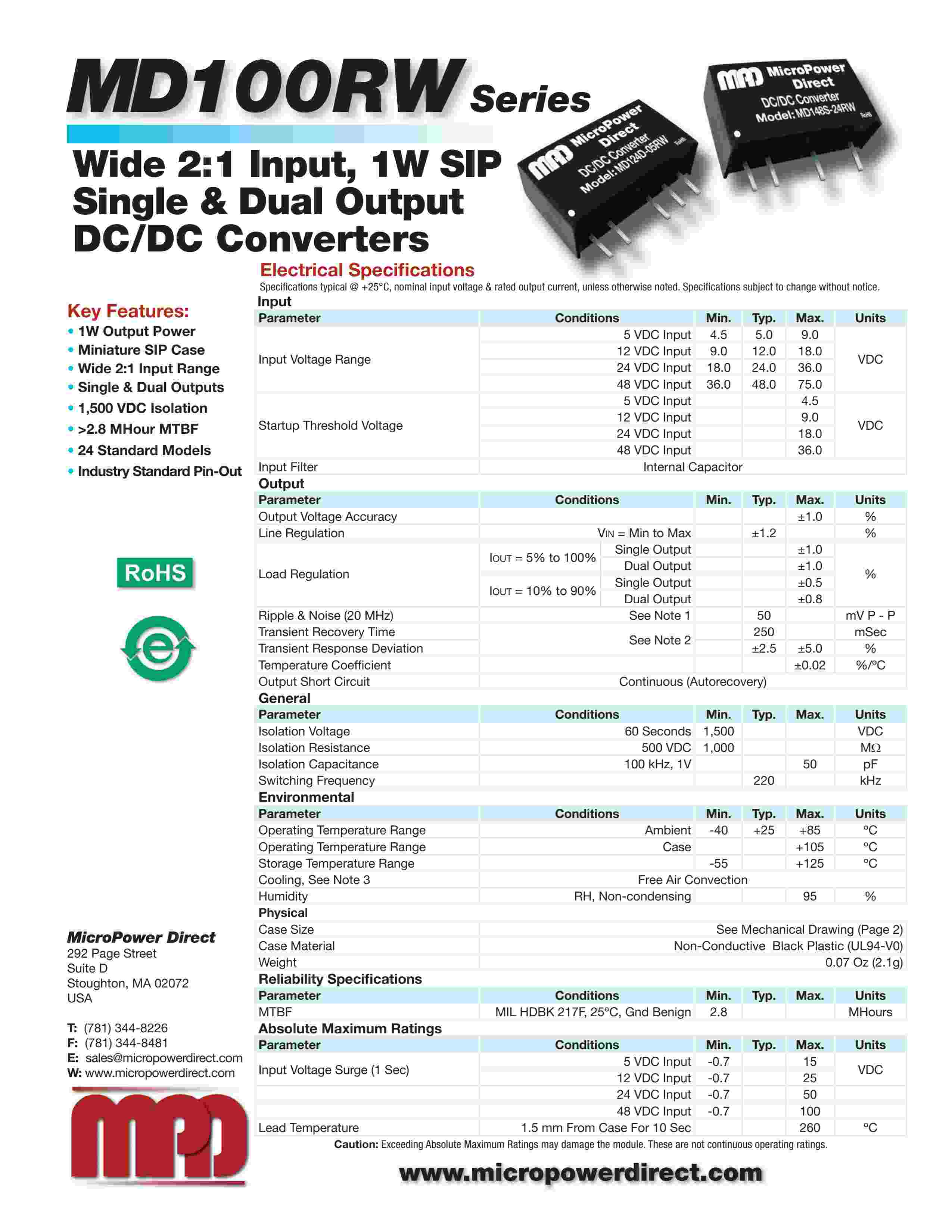 Wide 2:1 Input, 1W SIP Single & Dual Output DC/DC Con vert ers