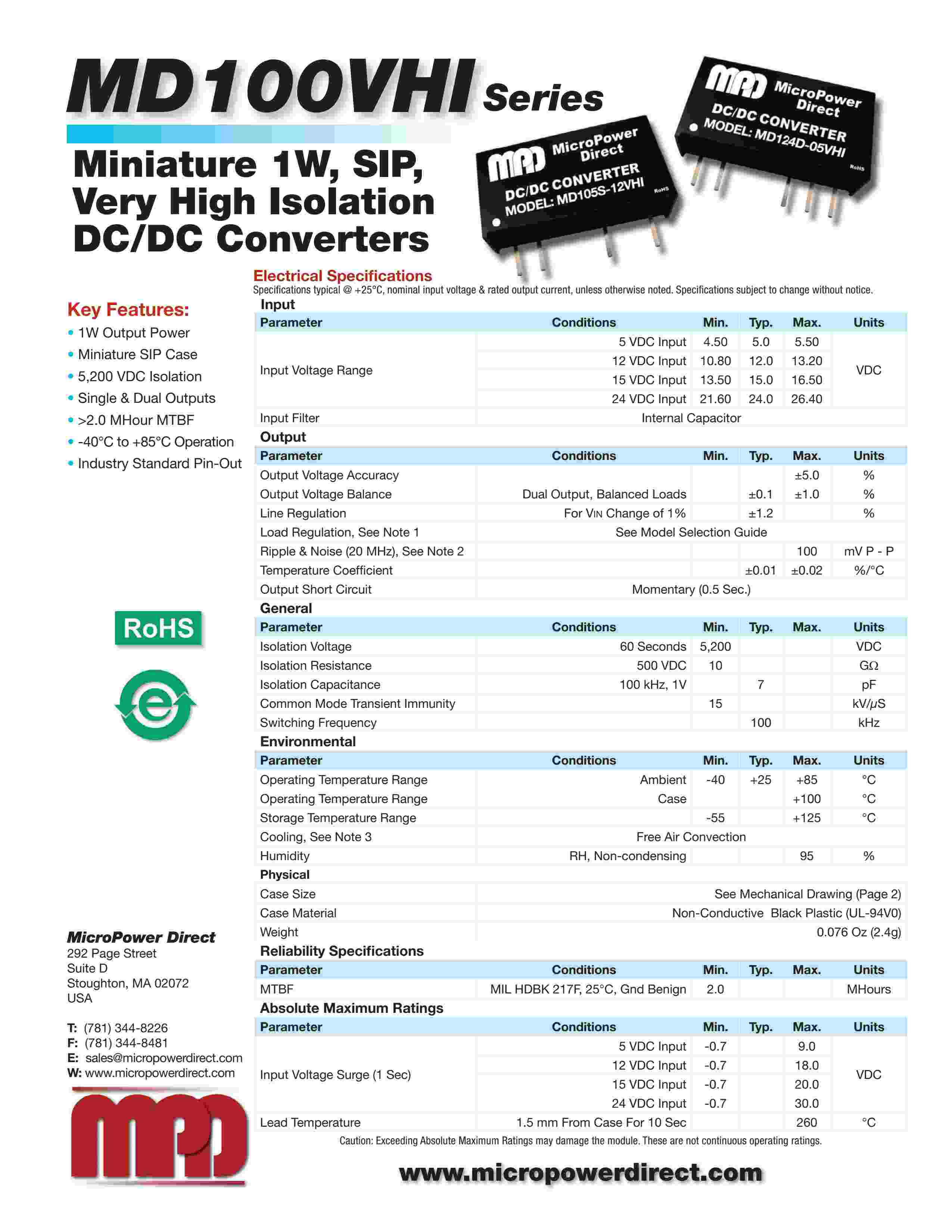 Wide 2:1 Input, 1W SIP Single & Dual Output DC/DC Con vert ers