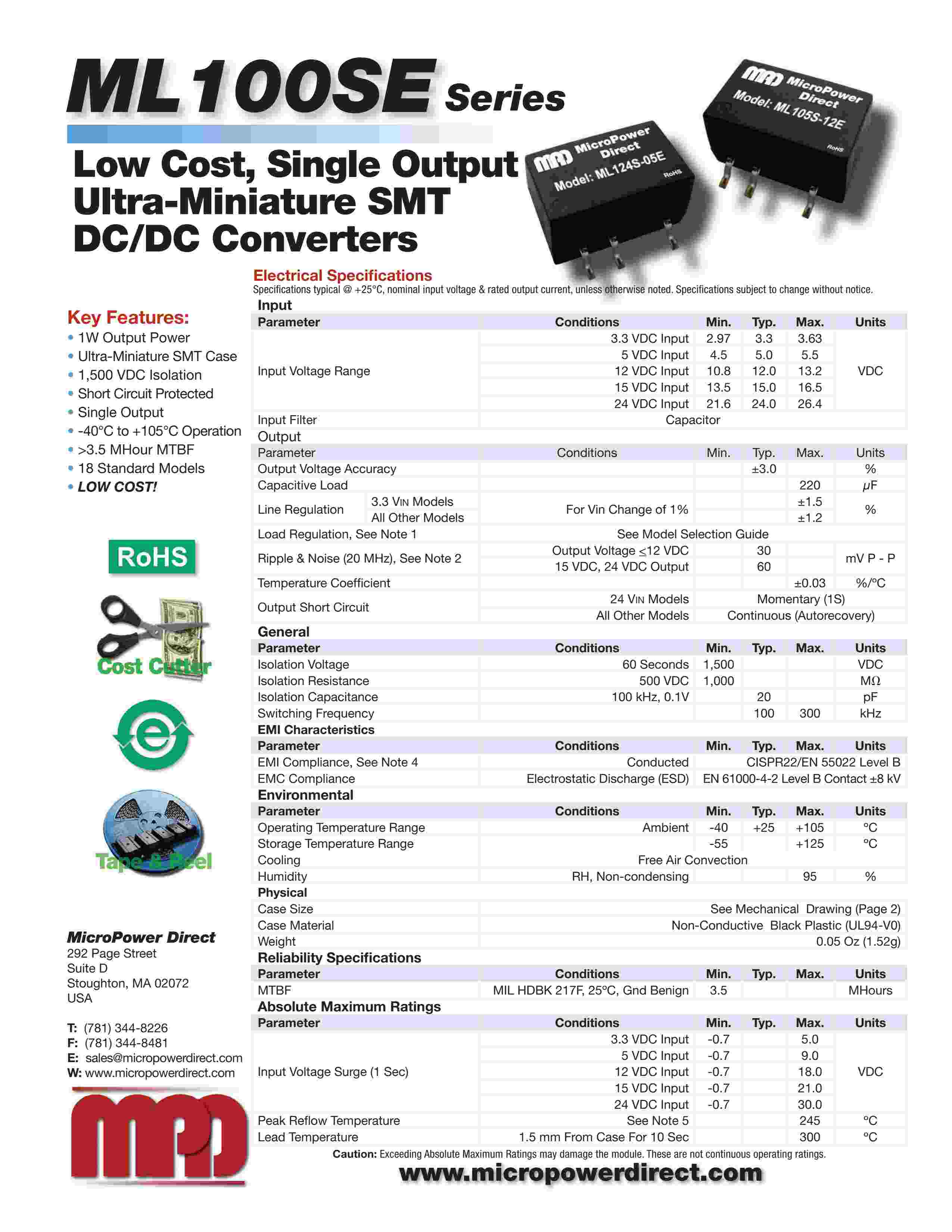 Low Cost, Single Output Ultra-Miniature SMT DC/DC Con vert ers