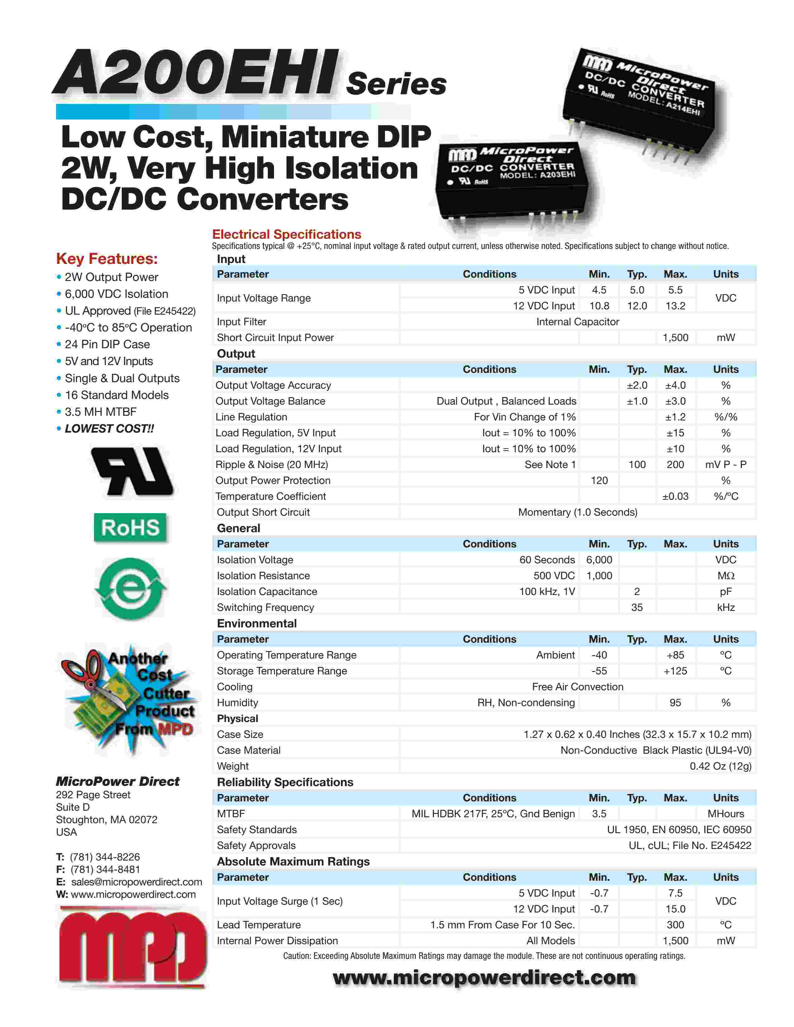 Low Cost, Miniature DIP 2W, Very High Isolation DC/DC Con vert ers
