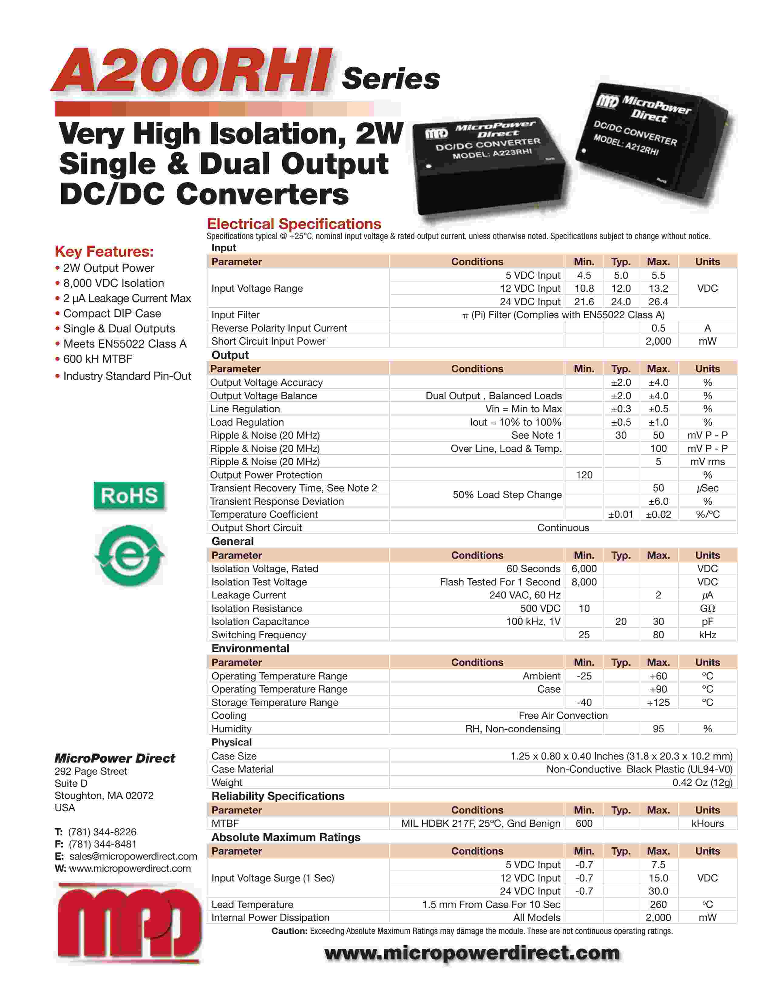Very High Isolation, 2W Single & Dual Output DC/DC Con vert ers