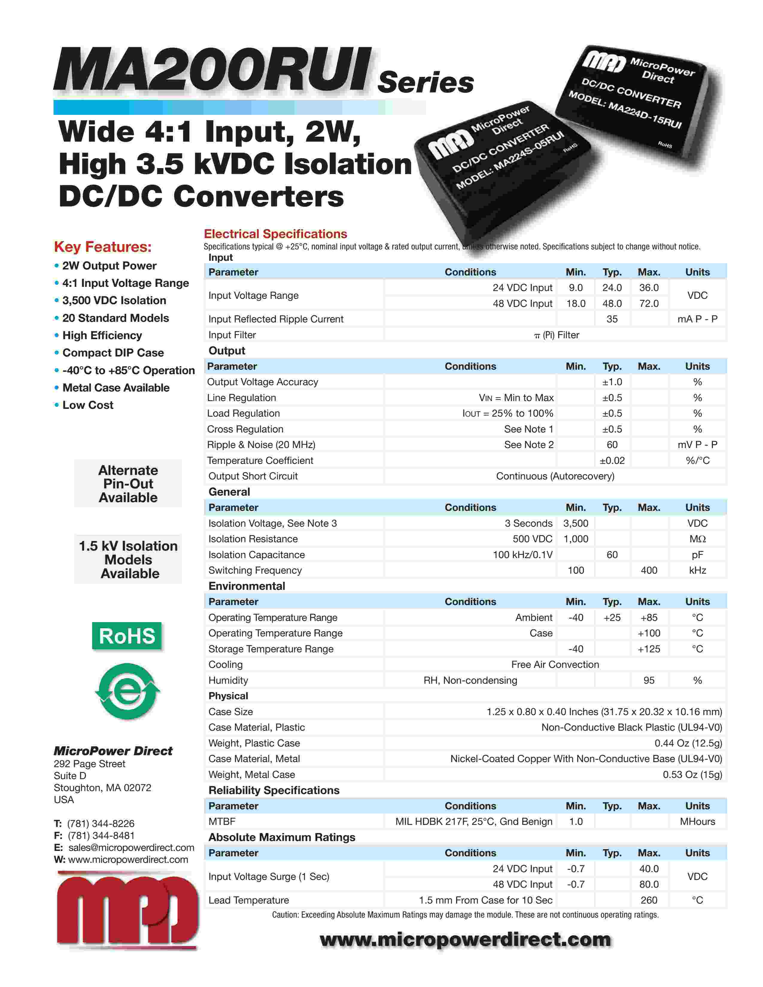 Wide 4:1 Input, 2W, High 3.5 kVDC Isolation DC/DC Con vert ers