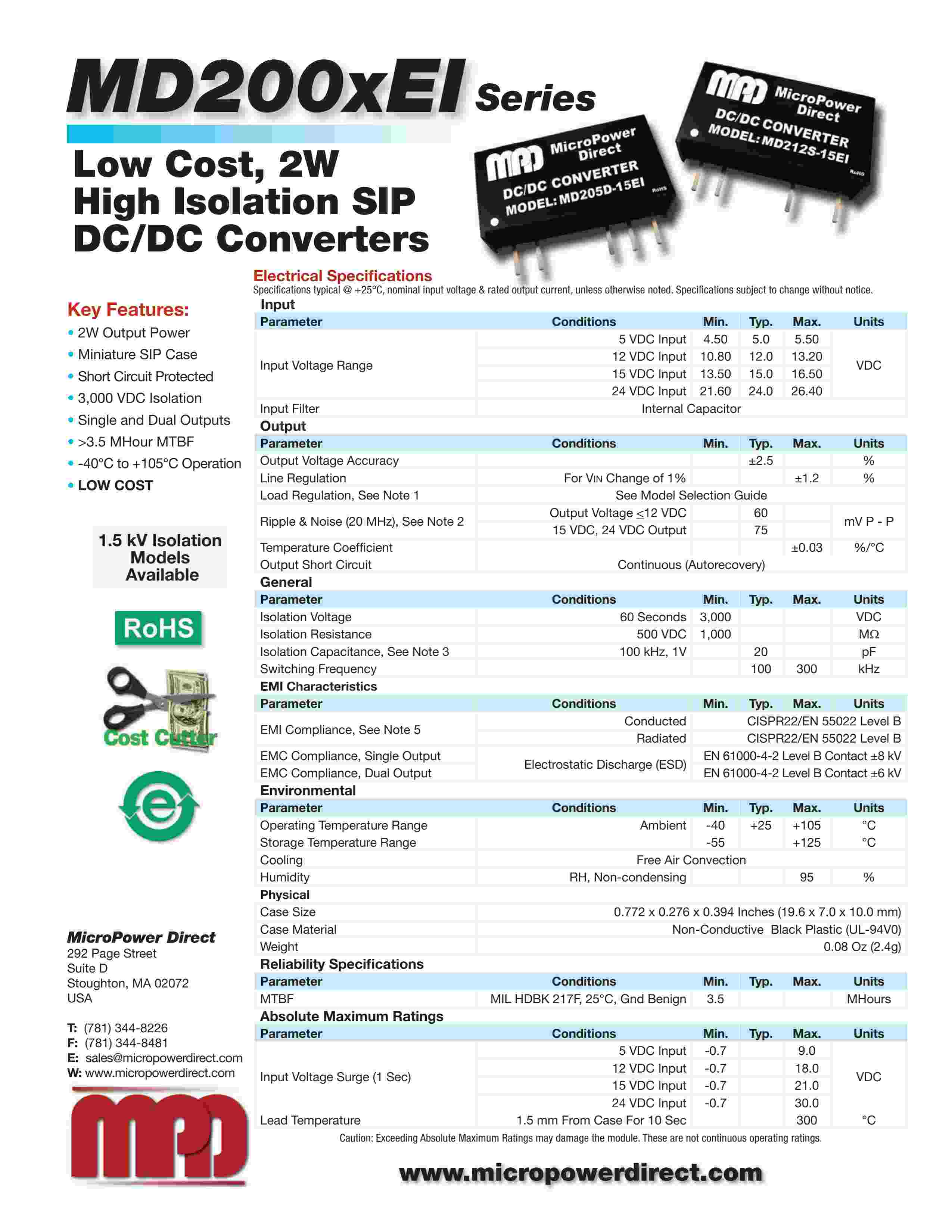 Low Cost, 2W High Isolation SIP DC/DC Con vert ers