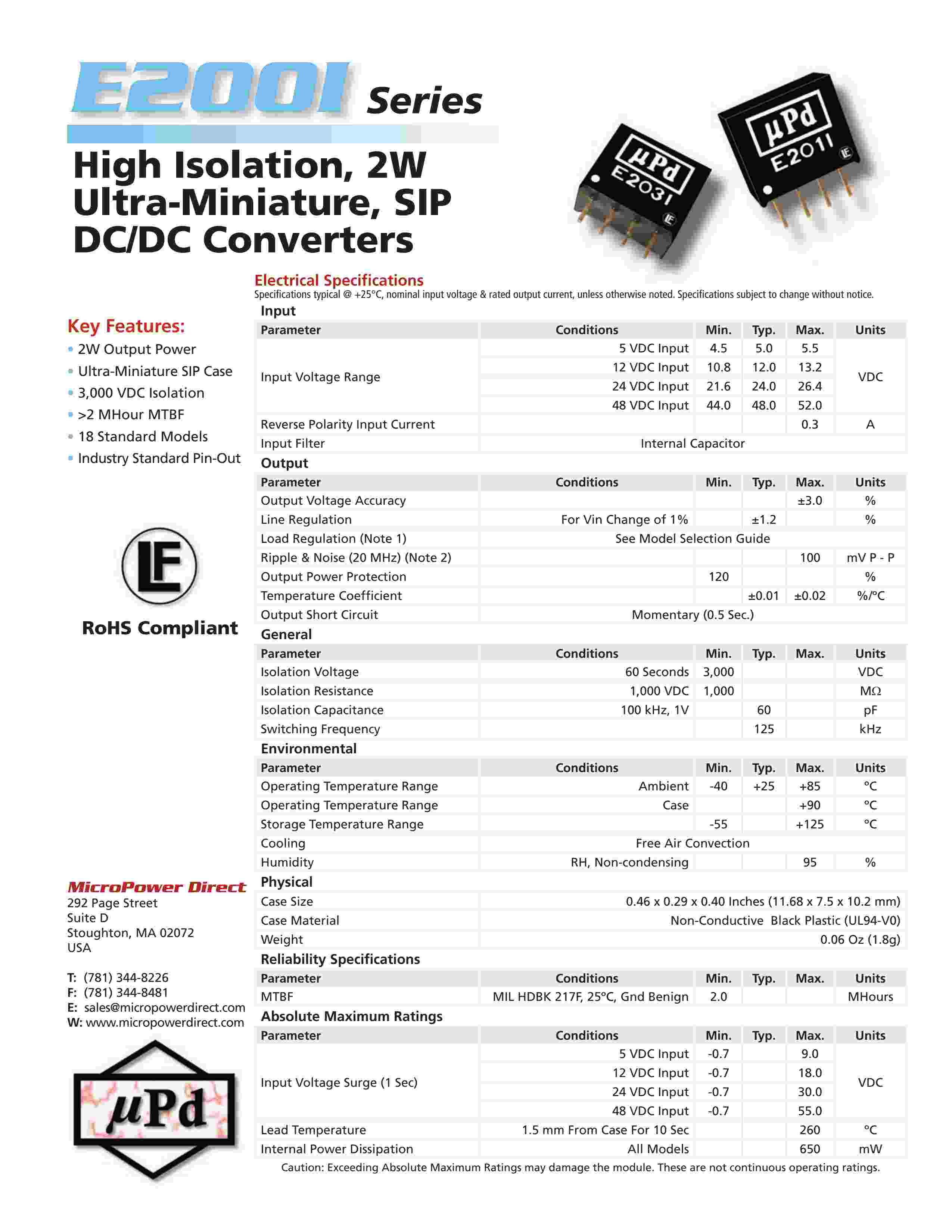High Isolation, 2W Ultra-Miniature, SIP DC/DC Con vert ers
