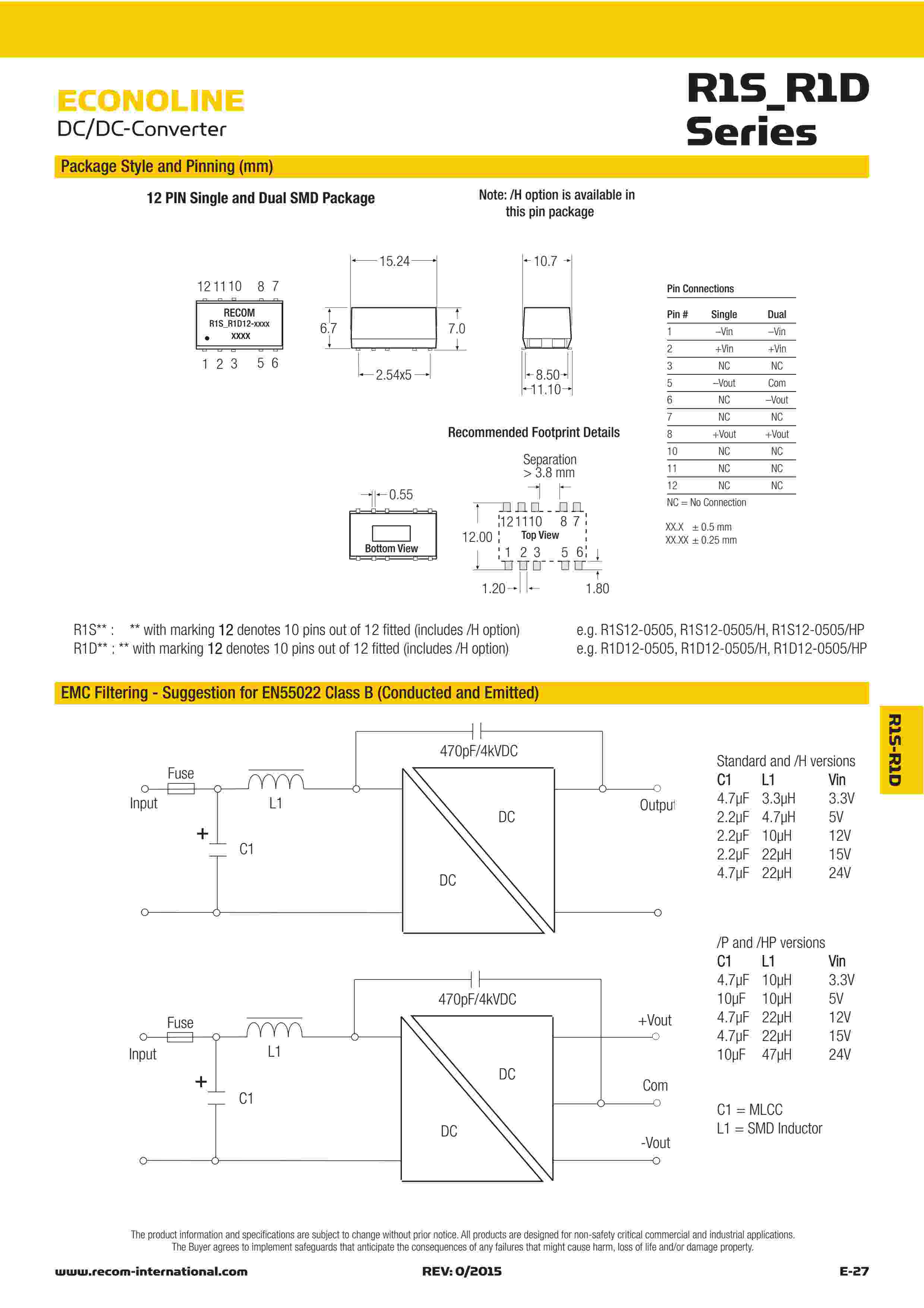 | 描 述: | ● Fully RoHS 6/6 Conform● Full Power at 100°C Ambient Temperature● 1kVDC or 3kVDC Isolation Options● UL /CSA Certified, CB Report● Suitable for Fully Automated Assembly (including Vapour Phase Soldering)● Optional Continuous Short Circuit Protection● Efficiency to 84% ● Built-In EN55022 Class A Filter | ||