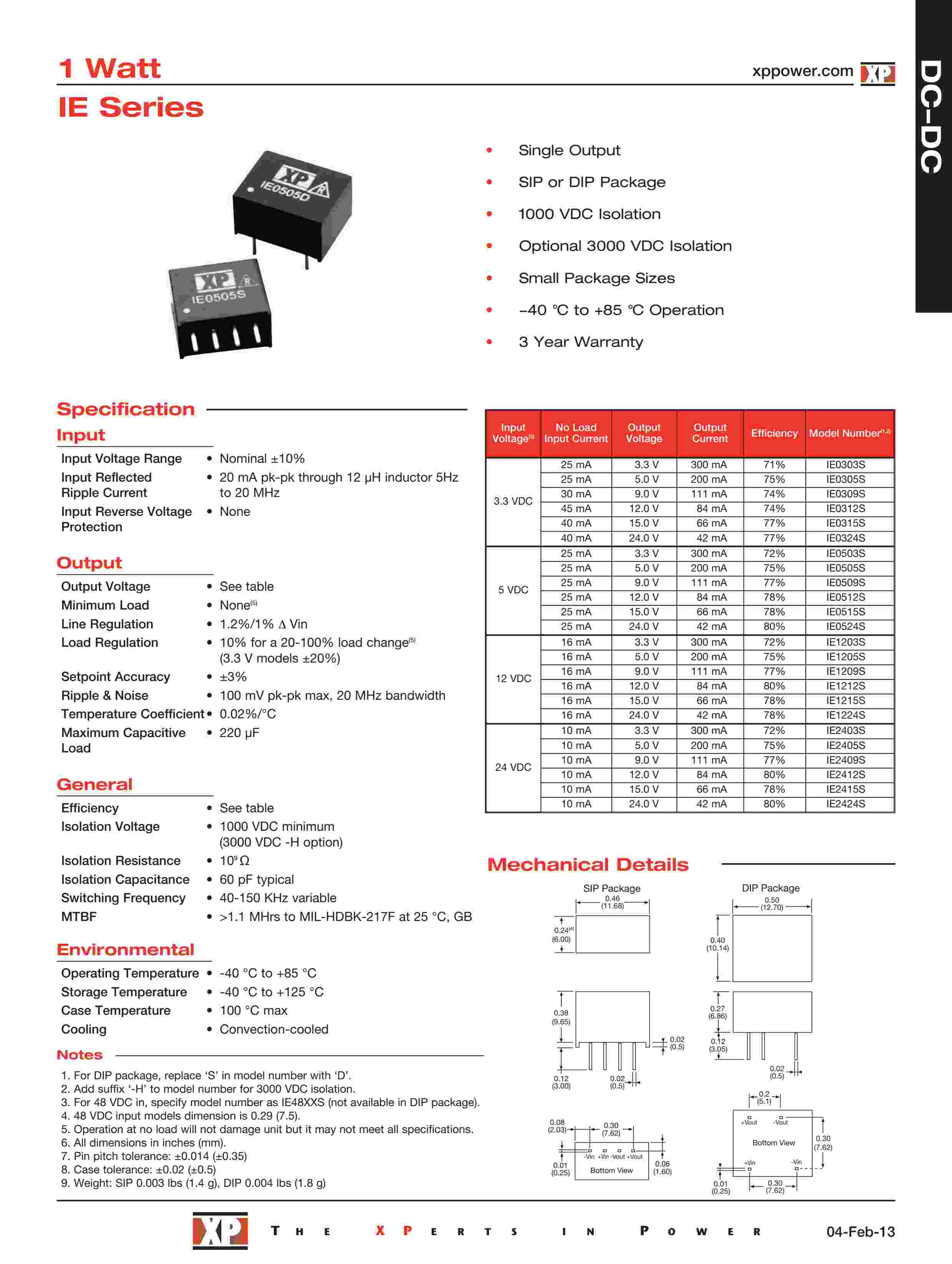 1 Watt Single Output • SIP or DIP Package • 1000 VDC Isolation • Optional 3000 VDC Isolation