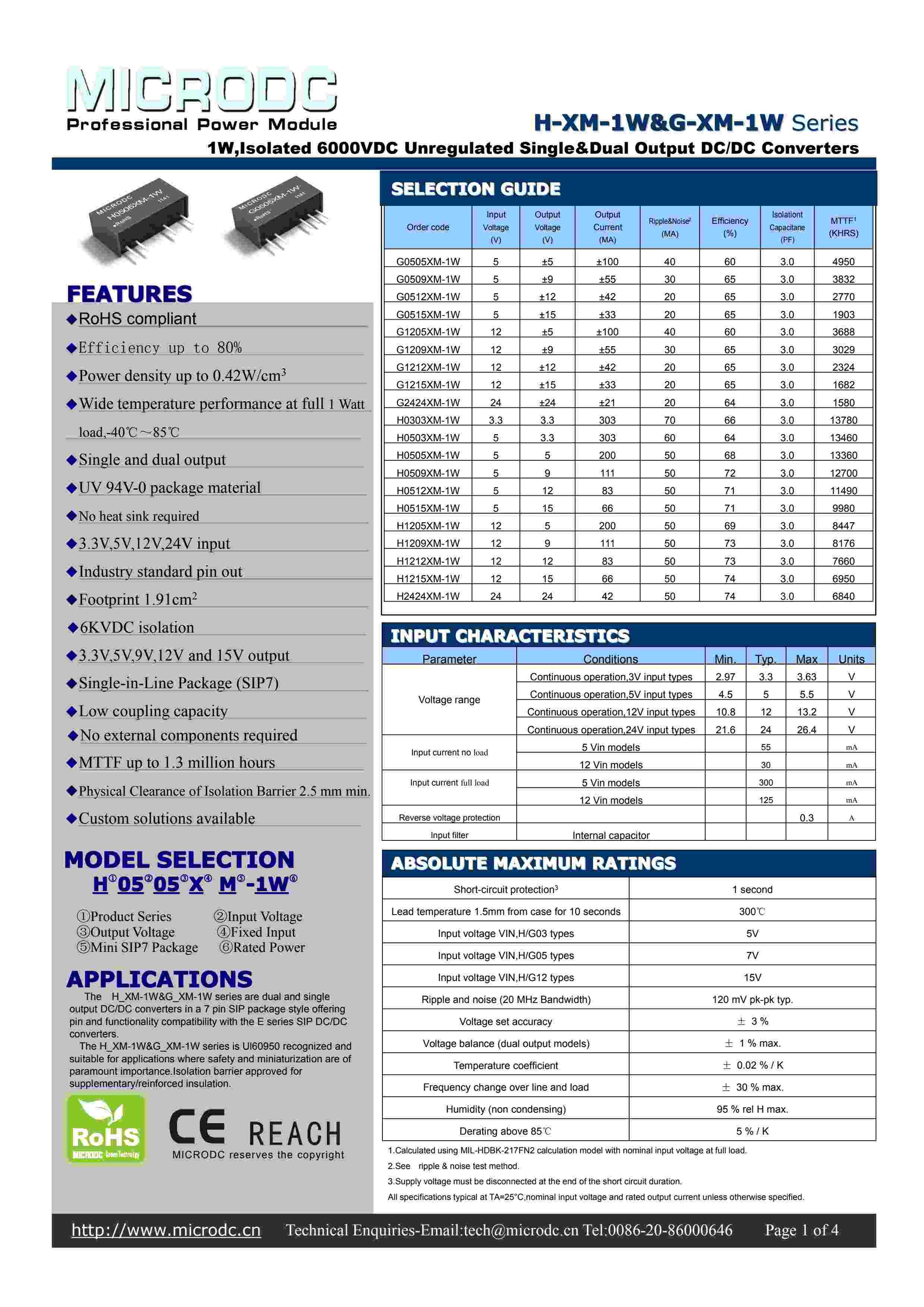 1W,Isolated 6000VDC Unregulated Dual Output DC/DC Converters
