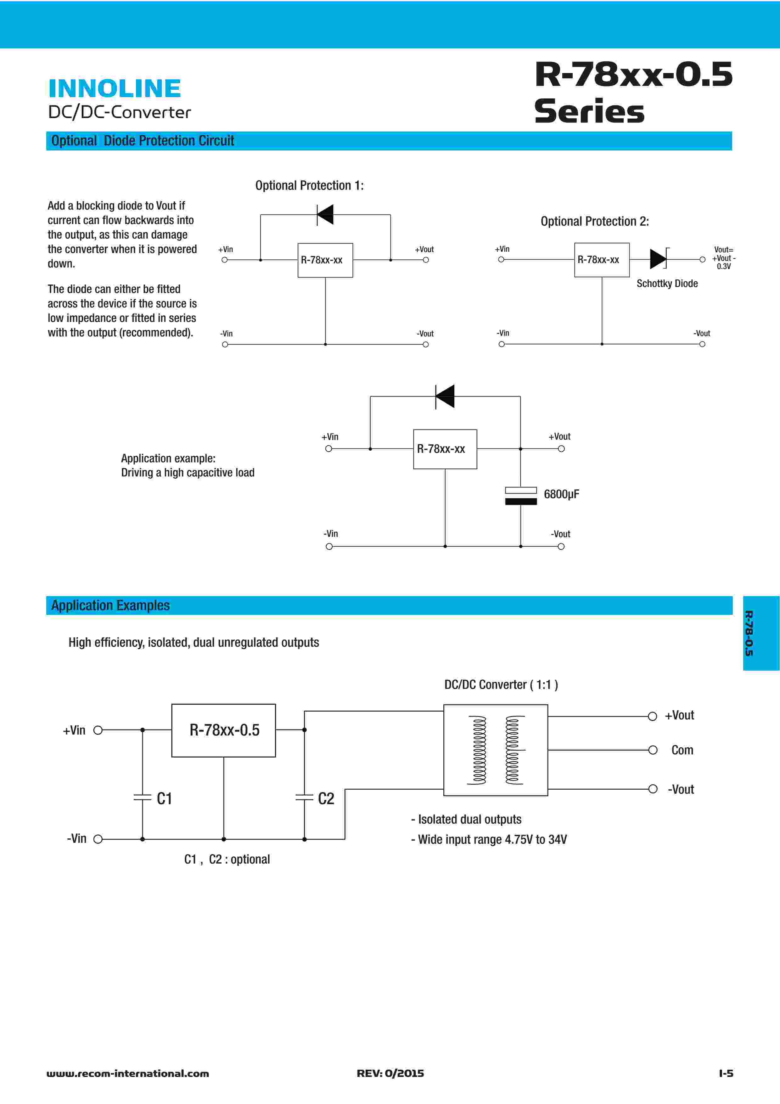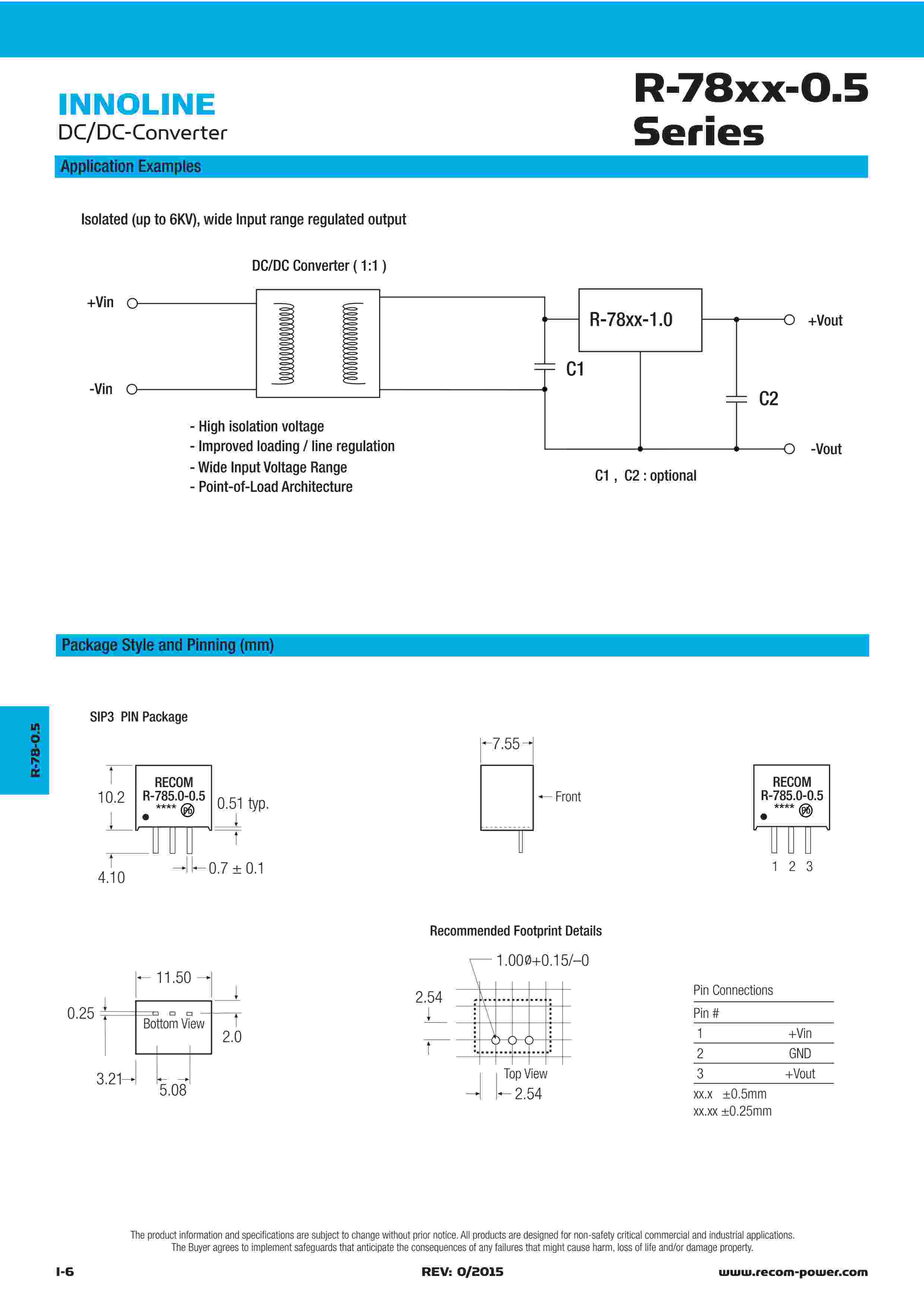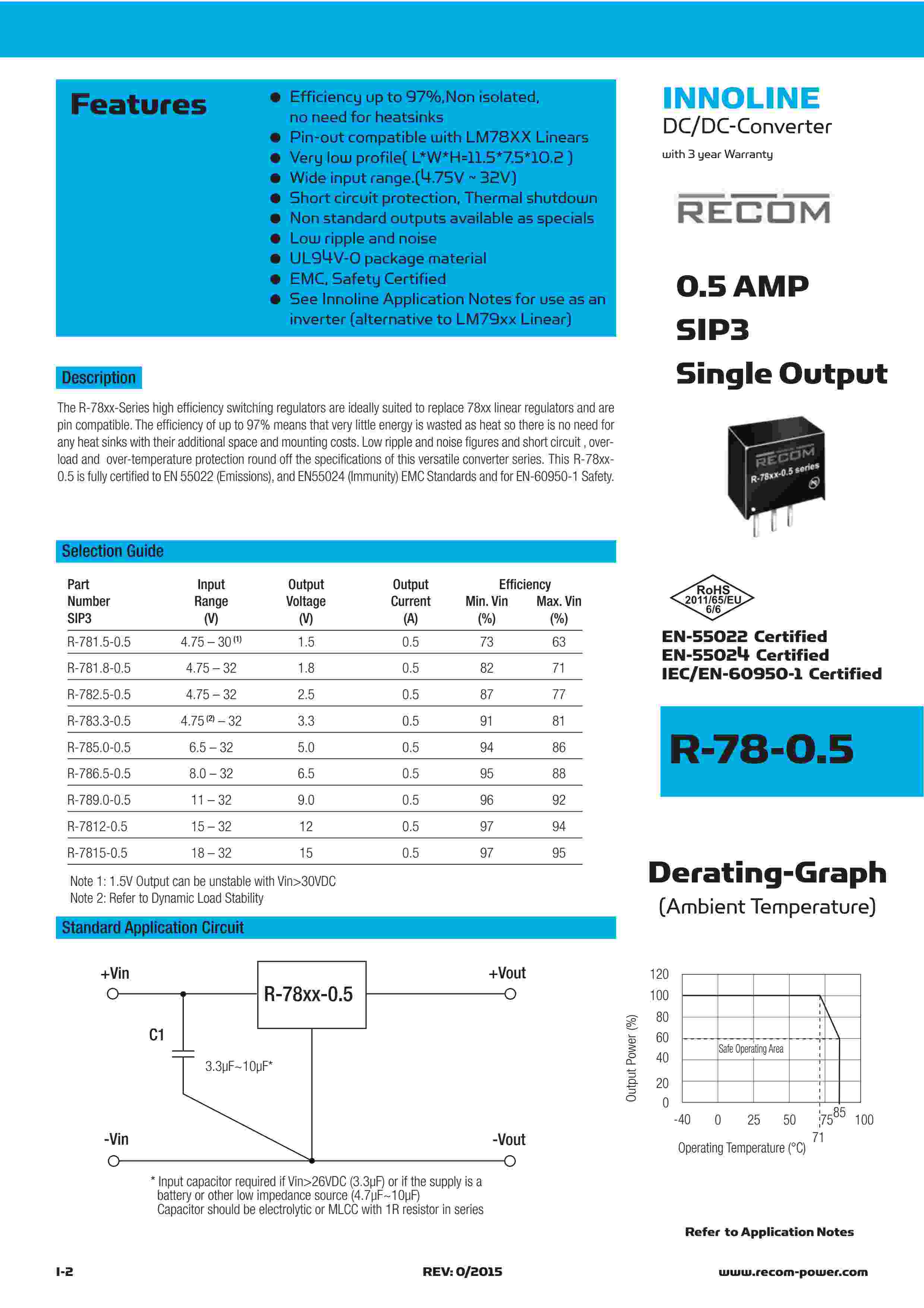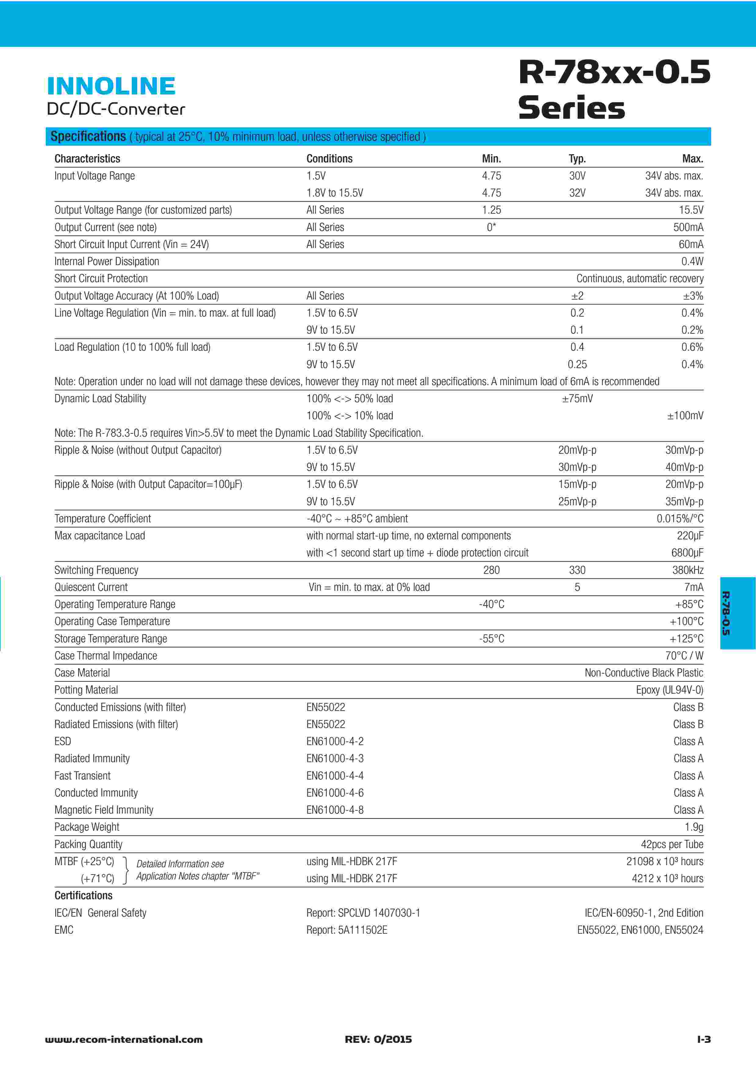 | 描 述: | ● Efficiency up to 97%,Non isolated, no need for heatsinks● Pin-out compatible with LM78XX Linears● Very low profile( L*W*H=11.5*7.5*10.2 )● Wide input range.(4.75V ~ 32V)● Short circuit protection, Thermal shutdown ● Non standard outputs available as specials● Low ripple and noise● UL94V-0 package material● EMC, Safety Certified● See Innoline Application Notes for use as an inverter (alternative to LM79xx Linear) | ||