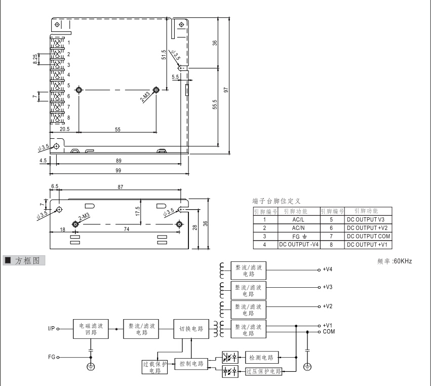 | 输入电压 | 88-264VAC | 温度范围 | -40˚cto+85˚c |
